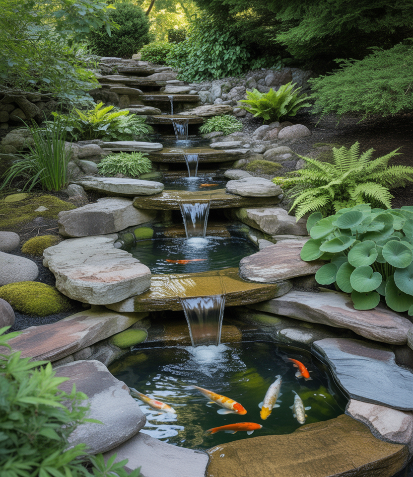 Turn elevation to your advantage by layering rocks into small cascades that feed into a raised lower pond. The sound masks street noise while keeping oxygen levels healthy for fish and wildlife. Works beautifully in sloped backyard gardens or terraced patios, adding movement and sound to the design.