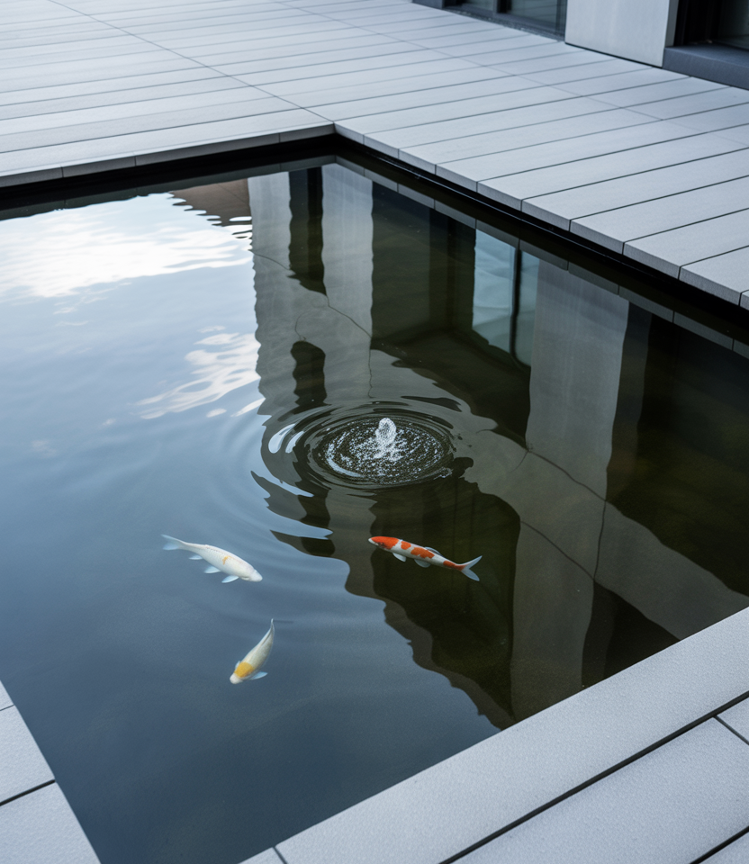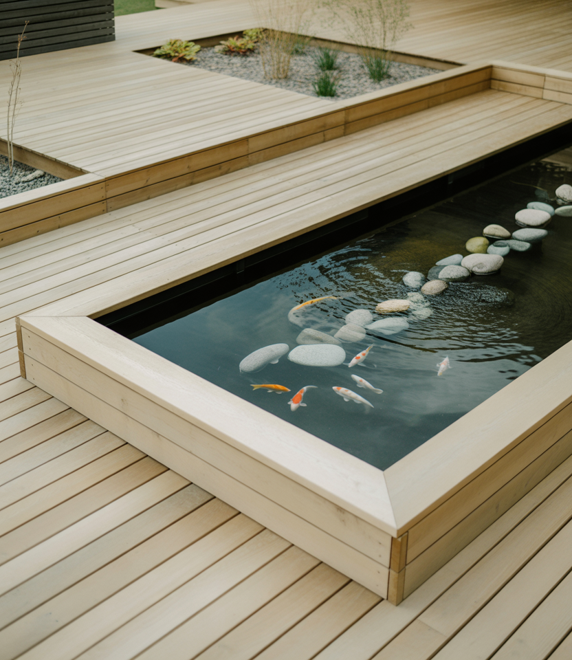 Inspired by Nordic minimalism, this stylish raised rectangular pond uses pale wood decking, smooth stones, and cool neutral tones. Small fish or backyard fish move slowly beneath calm water that mirrors light. The design focuses on clean geometry, natural texture, and stillness—ideal for modern homes that value clarity, warmth, and subtle natural beauty.