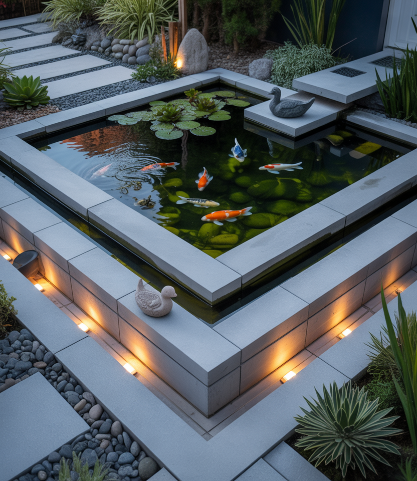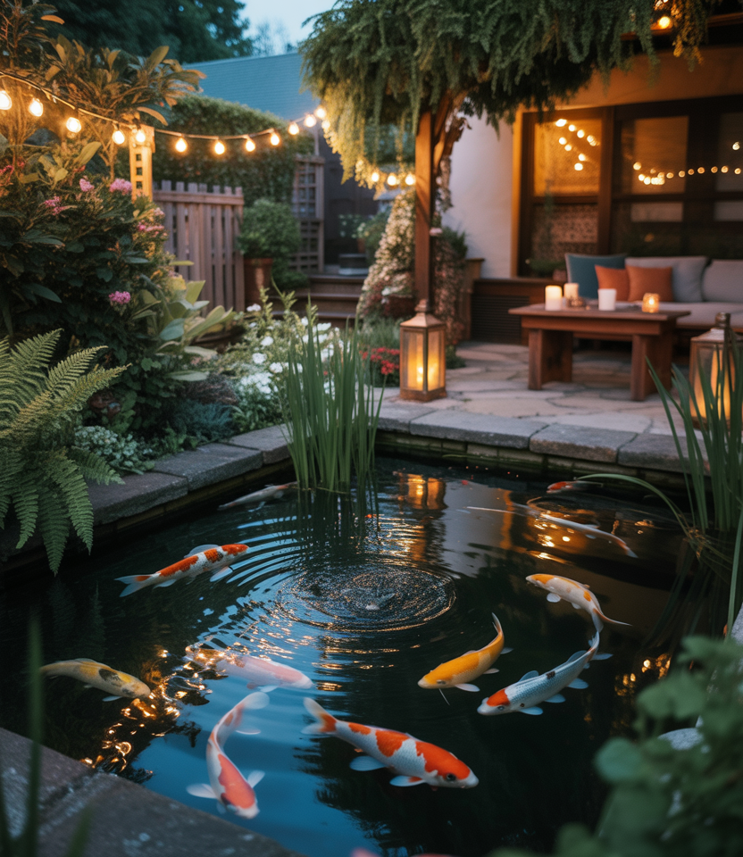 Nothing beats soft lighting reflected on water. Wrap the garden trees or pergola near your pond with fairy lights, illuminating small fish as they glide beneath the shimmering surface. It’s magical for patios, small backyard corners, or intimate gatherings. Add candles or solar lanterns for a warm evening retreat straight out of a dream.