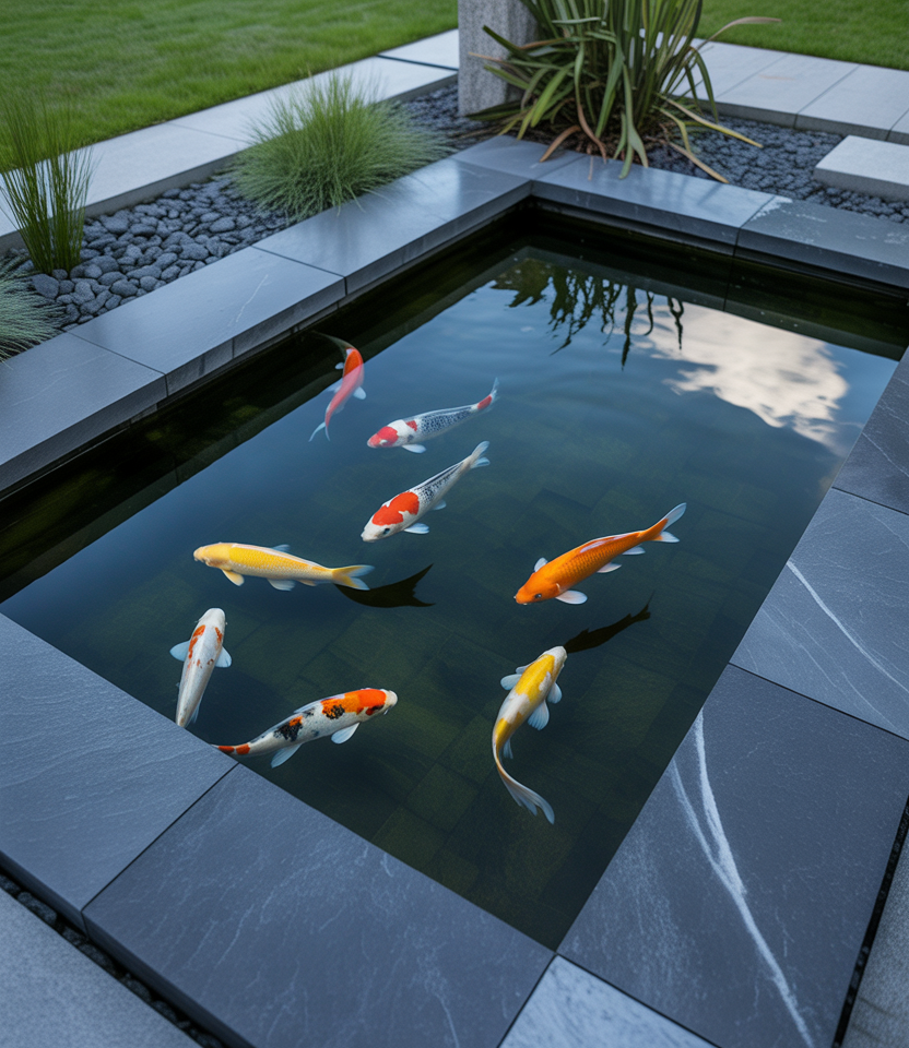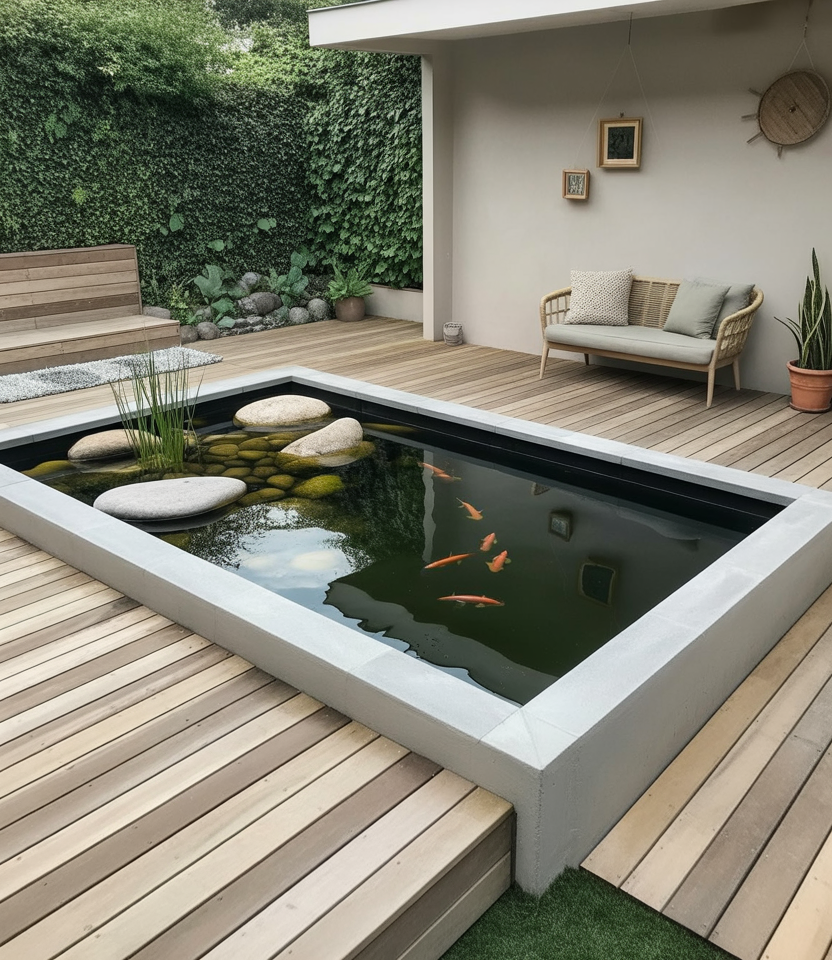 Inspired by Nordic minimalism, this stylish raised rectangular pond uses pale wood decking, smooth stones, and cool neutral tones. Small fish or backyard fish move slowly beneath calm water that mirrors light. The design focuses on clean geometry, natural texture, and stillness—ideal for modern homes that value clarity, warmth, and subtle natural beauty.