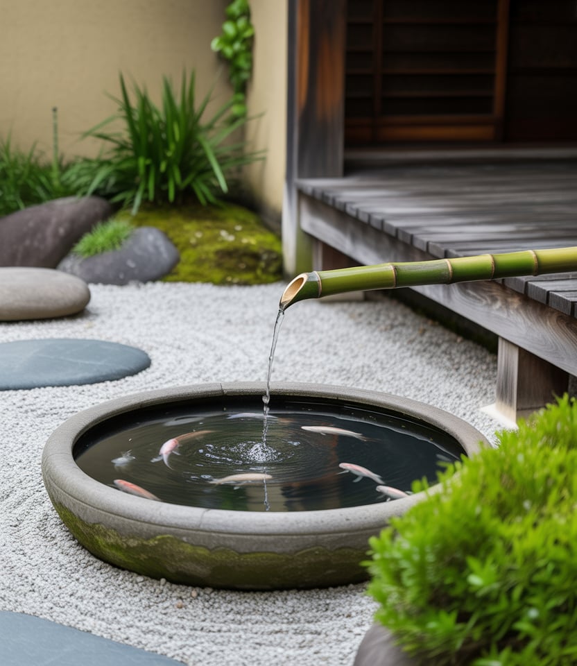 A natural Japanese-style water feature combines calmness with minimalist design. Use smooth river stones, bamboo spouts, and shallow water over gravel. Add small fish for motion and serenity. Perfect for compact courtyards or meditative garden corners where sound and reflection invite calmness after a busy day.