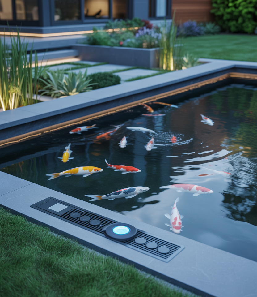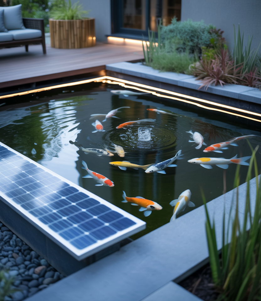 Modern outdoor ponds can shine day and night thanks to solar lighting and pumps. Floating solar panels keep water aerated for fish while subtle LEDs illuminate edges. Great for small backyard or patio settings where sustainability meets aesthetics—proof that eco-design can still be stunning.