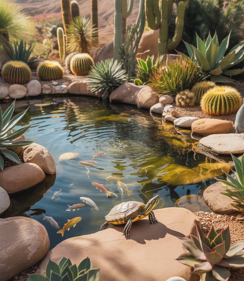 For those in warm, dry climates, a pond that mimics a natural oasis fits beautifully into desert landscaping. Frame it with succulents and gravel, keeping water shallow but cool for turtles or small fish. This style merges the raw textures of desert rock with lush aquatic contrast—an eye-catching balance.
