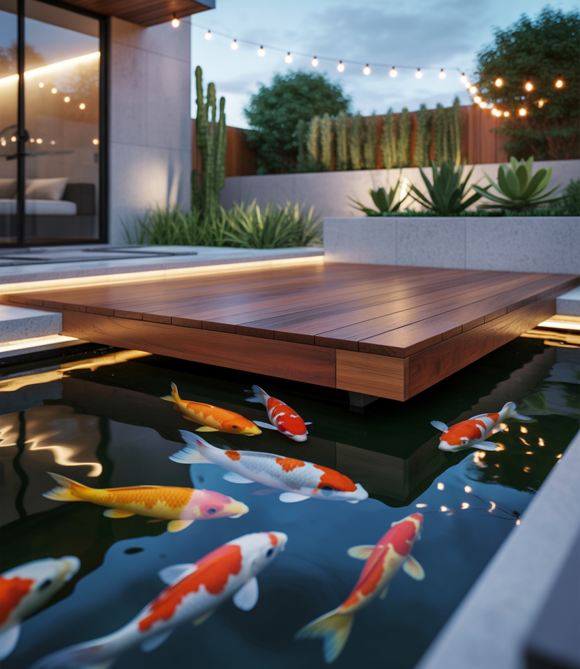 Design a floating deck above a shallow pond so that your guests literally sit above water. Beneath, graceful koi, or garden fish, move in calm rhythm. It’s a sophisticated solution for backyard parties, pairing modern architecture with the soothing sound of water. Add subtle lights for evening glow.