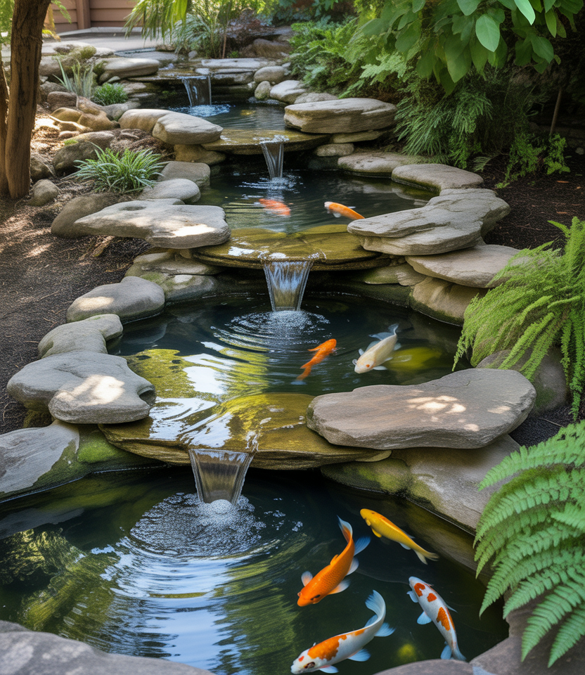 Turn elevation to your advantage by layering rocks into small cascades that feed into a raised lower pond. The sound masks street noise while keeping oxygen levels healthy for fish and wildlife. Works beautifully in sloped backyard gardens or terraced patios, adding movement and sound to the design.