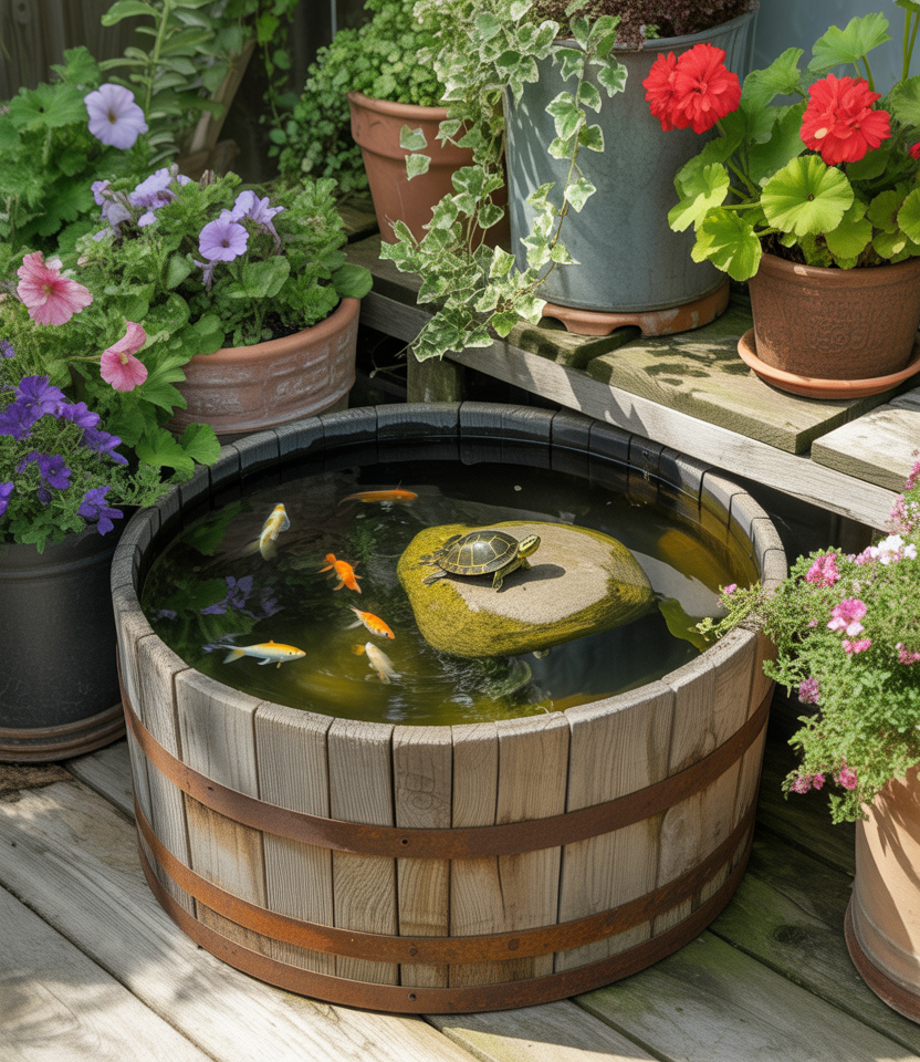 Repurpose a half-barrel into a cozy small garden pond—charming, inexpensive, and full of personality. Add aquatic plants and small fish, maybe even a turtle companion. It fits the rustic cottage or farmhouse vibe perfectly and makes a wonderful DIY weekend project for creative decorators.