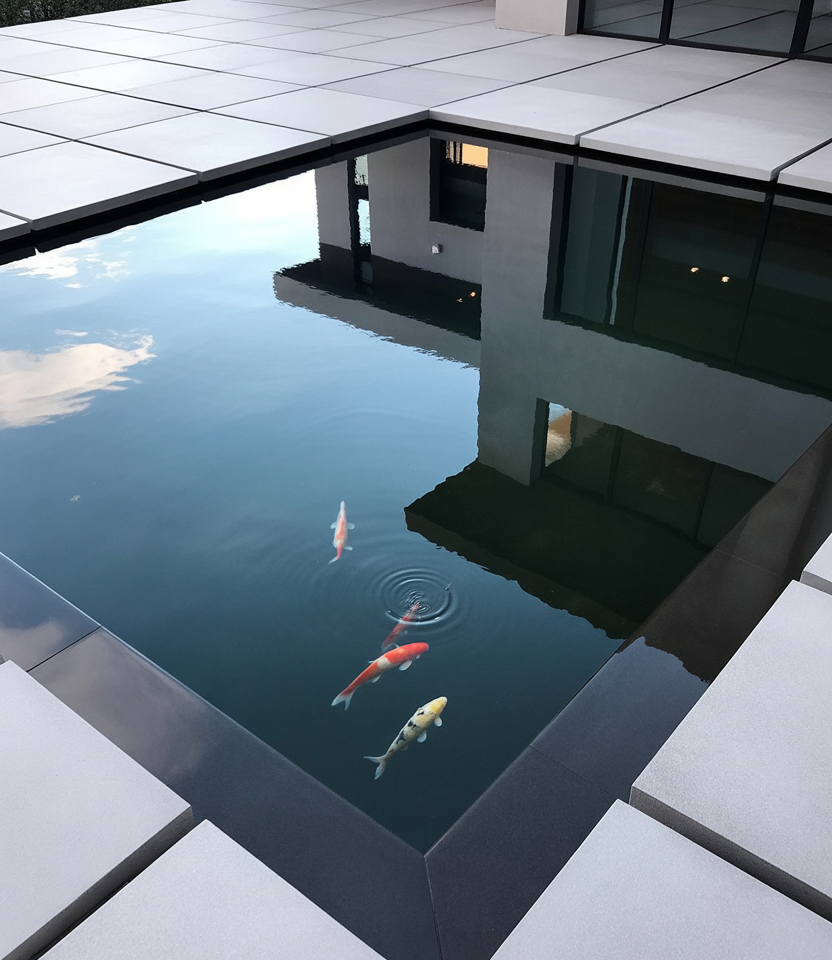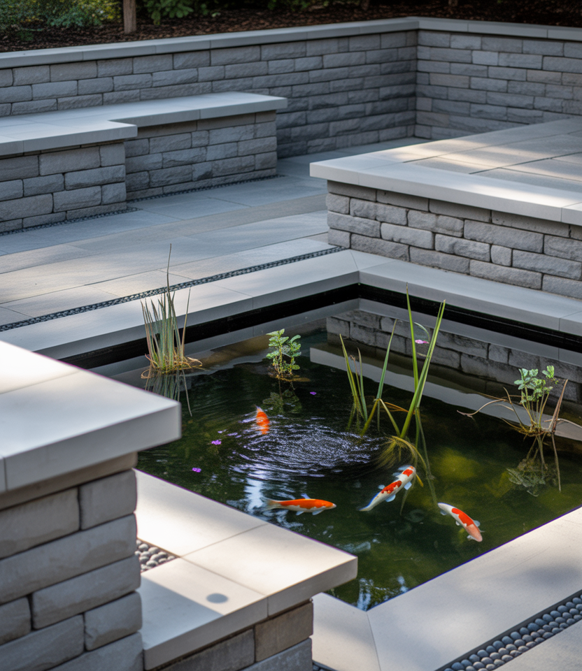 A carefully designed raised pond on the patio can become a sculptural highlight. Think stone or concrete walls, built-in bench seating, crisp design lines, and subtle lighting. This raised form works in combination with outdoor seating and entertaining, tying into patio zones. You could include small fish, maybe pair it with minimalist planting, and let the water become an immersive backdrop for outdoor living. It’s especially effective when your garden is an extension of your home’s design.