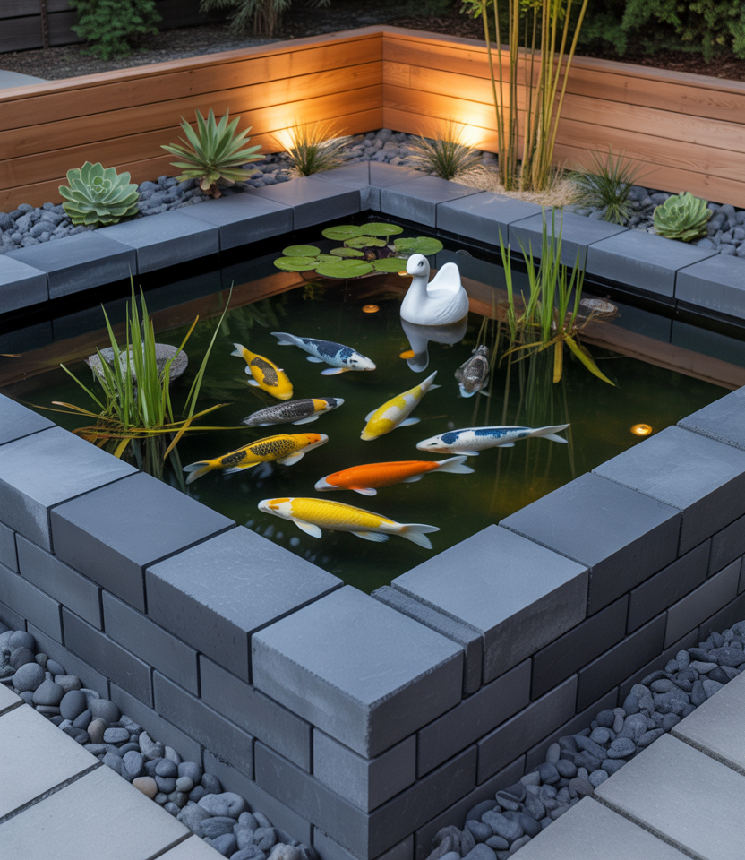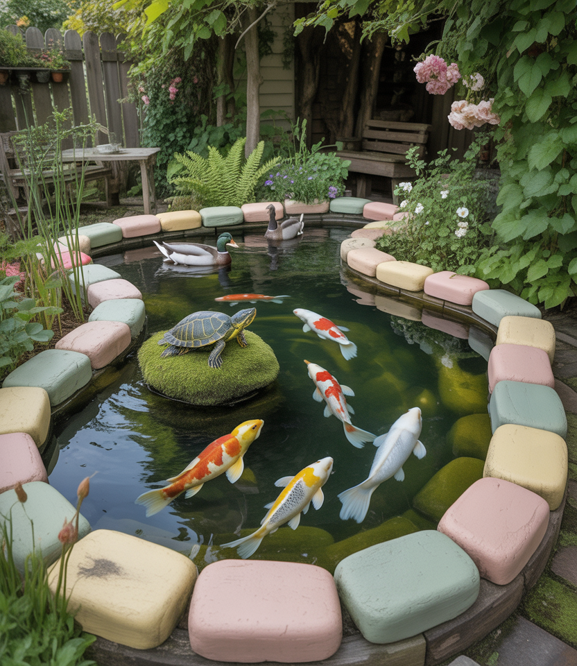 For those who love charm and personality in their outdoor spaces, a whimsical backyard pond corner adds storybook beauty to your landscape. Use pastel edging, smooth stones, and decorative duck or turtle accents to create a peaceful retreat filled with movement from small fish. This style works perfectly in a small fish pond or garden, offering warmth, creativity, and timeless character. It’s ideal for anyone who enjoys handmade touches and cozy natural design.