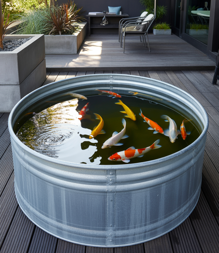 For homeowners wishing to avoid major excavation, a repurposed stock tank or metal trough raised to comfortable seating height becomes a striking focal point on a patio or deck. You can incorporate backyard fish, add a few small fish companions, and perhaps even add a decorative turtle basking factor. Because it’s elevated, it works beautifully on hardscape surfaces and adds a design-forward industrial-chic twist to typical backyard water features. It’s especially accessible for maintenance and offers a comfortable view of the aquatic life within.