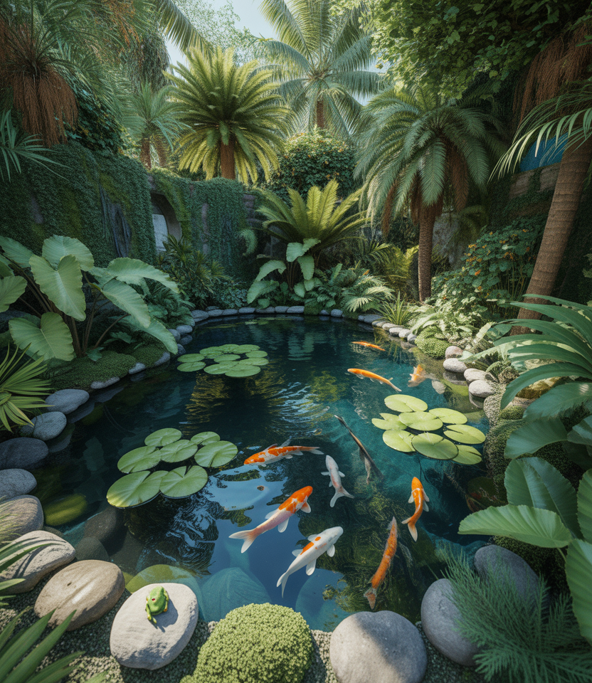 Transform your backyard into a tropical paradise by surrounding your pond with ferns, palms, and exotic blooms. Deep water shelters koi, while floating lilies host wildlife like frogs or dragonflies. The lush texture and humidity transport you straight to a vacation mood without leaving home.