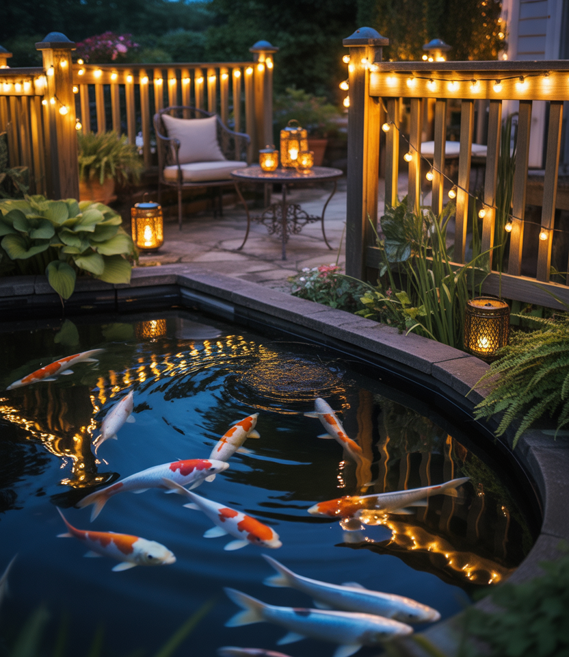 Nothing beats soft lighting reflected on water. Wrap the garden trees or pergola near your pond with fairy lights, illuminating small fish as they glide beneath the shimmering surface. It’s magical for patios, small backyard corners, or intimate gatherings. Add candles or solar lanterns for a warm evening retreat straight out of a dream.