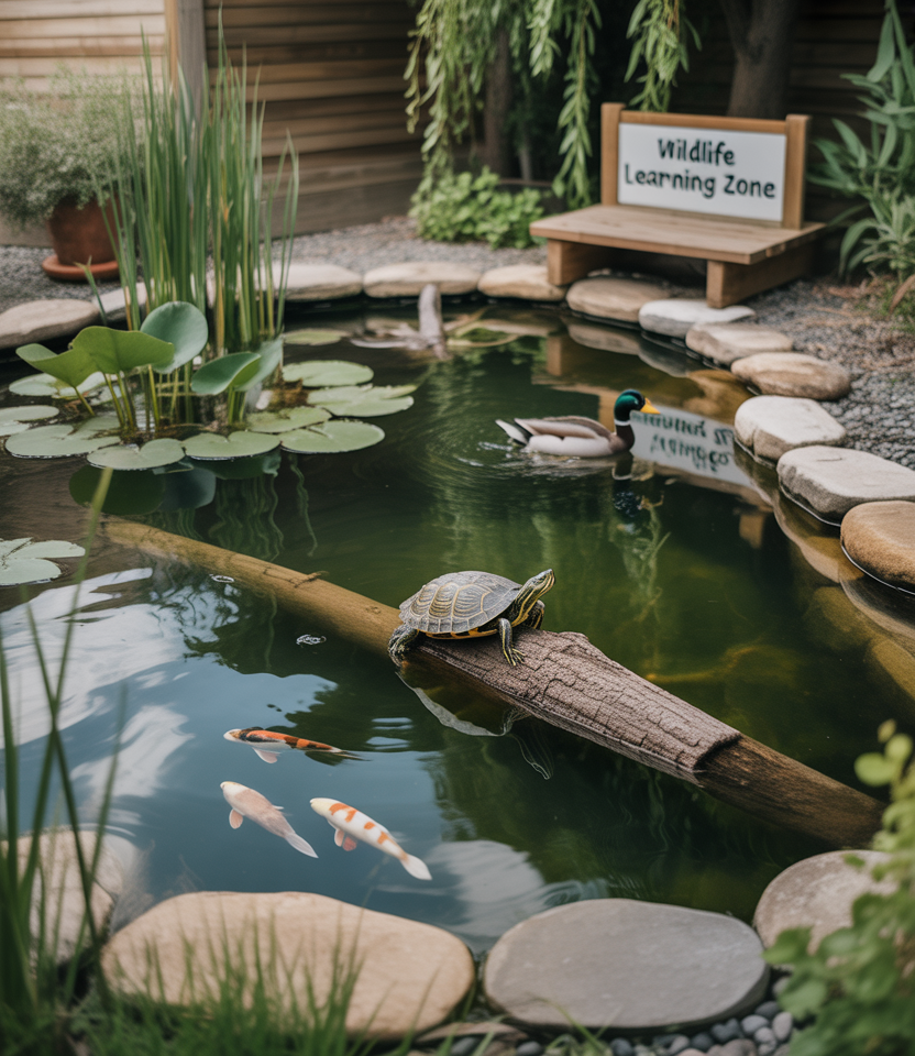 A wonderful and educational project for families: build a shallow back garden fish pond where children can safely observe tadpoles, turtle visits, and duck visits. Add signage or stepping stones for learning experiences about wildlife and ecosystems. It makes children nature-friendly by decorating your backyard with purpose and elegance.