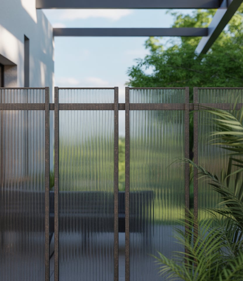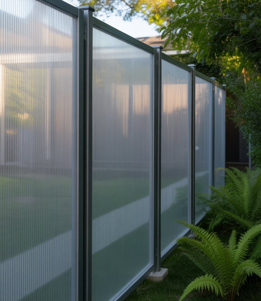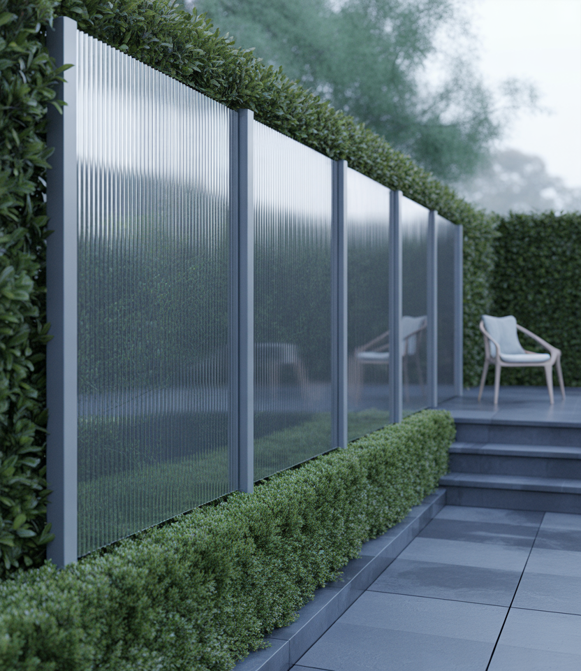 Translucent polycarbonate sheets can be used to let light in while still maintaining privacy. Great for patio, pool area or small areas where you want brightness rather than complete opacity. Use as a top strip above solid fence or full paneling. It’s relatively cheap and modern in feel.
