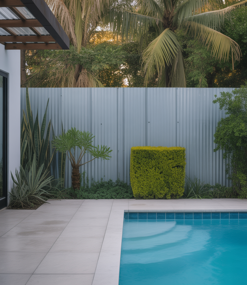 Metal gives awesomely stark privacy with industrial vibes. Best for large properties or pool area, can go either heavy or light. For thin gauge sheets, keep it cheap. Partner it with timber or steel posts for contrast. It is truly unique, durable, and low-maintenance, and highly favored in modern backyard ideas.