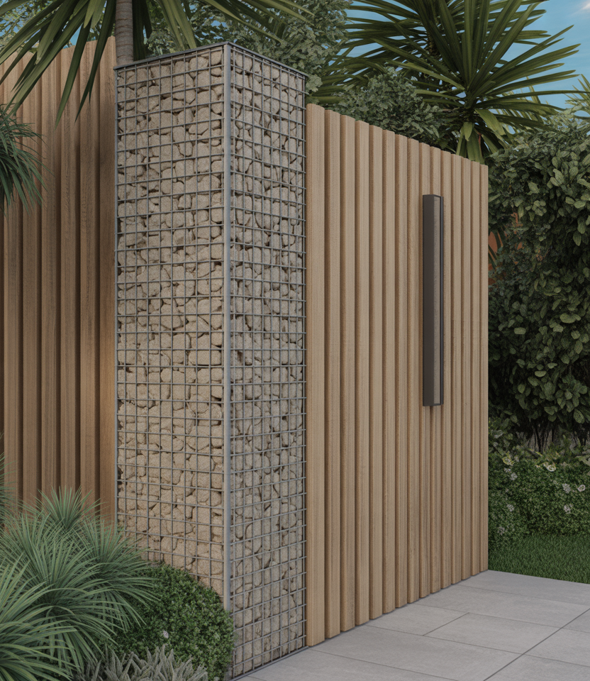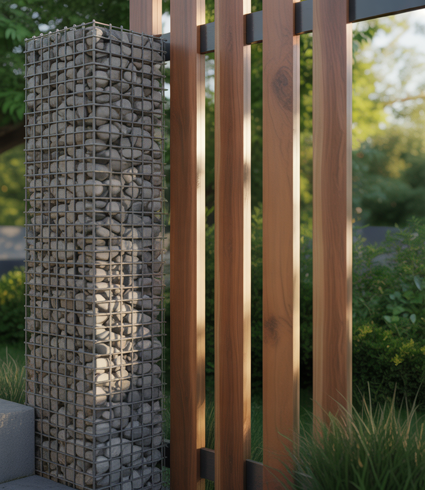Mix gabion columns spaced with wood or metal screens between. This gives visual weight and sensitive transparency. Works well for large properties or front yard statements. Use unique stone fill or colored glass. The combination feels upscale and structural.