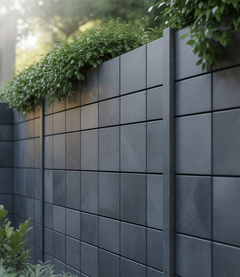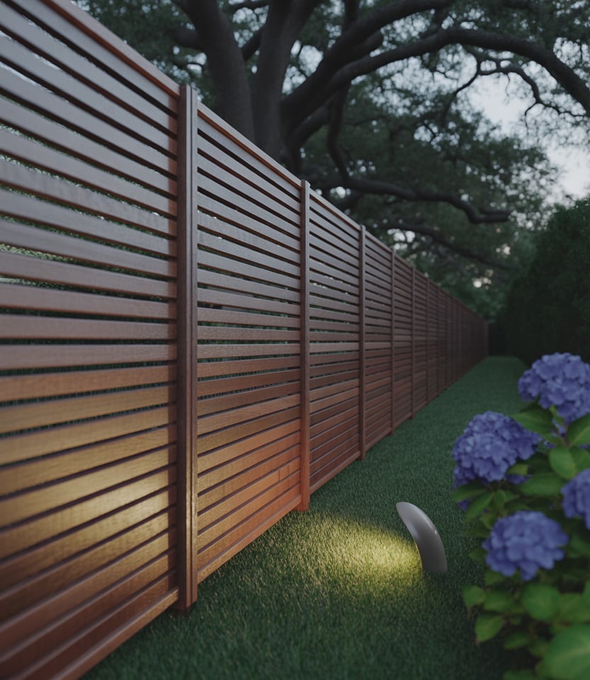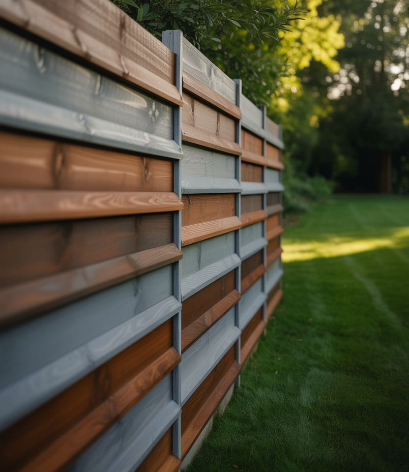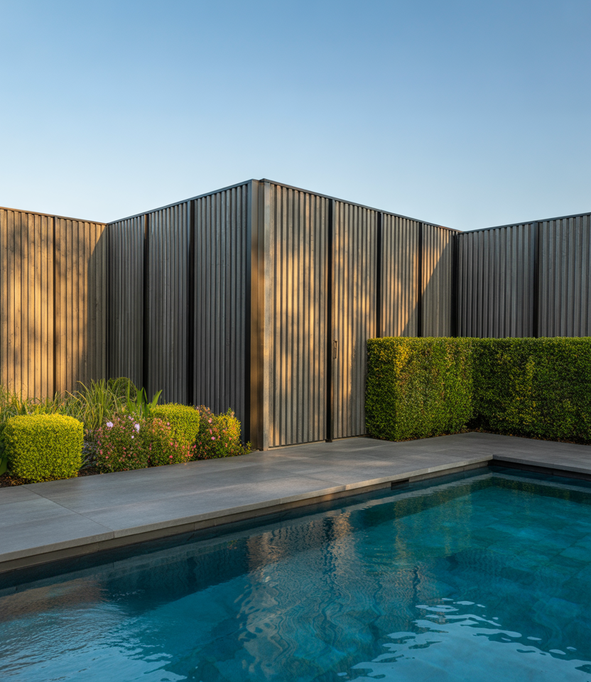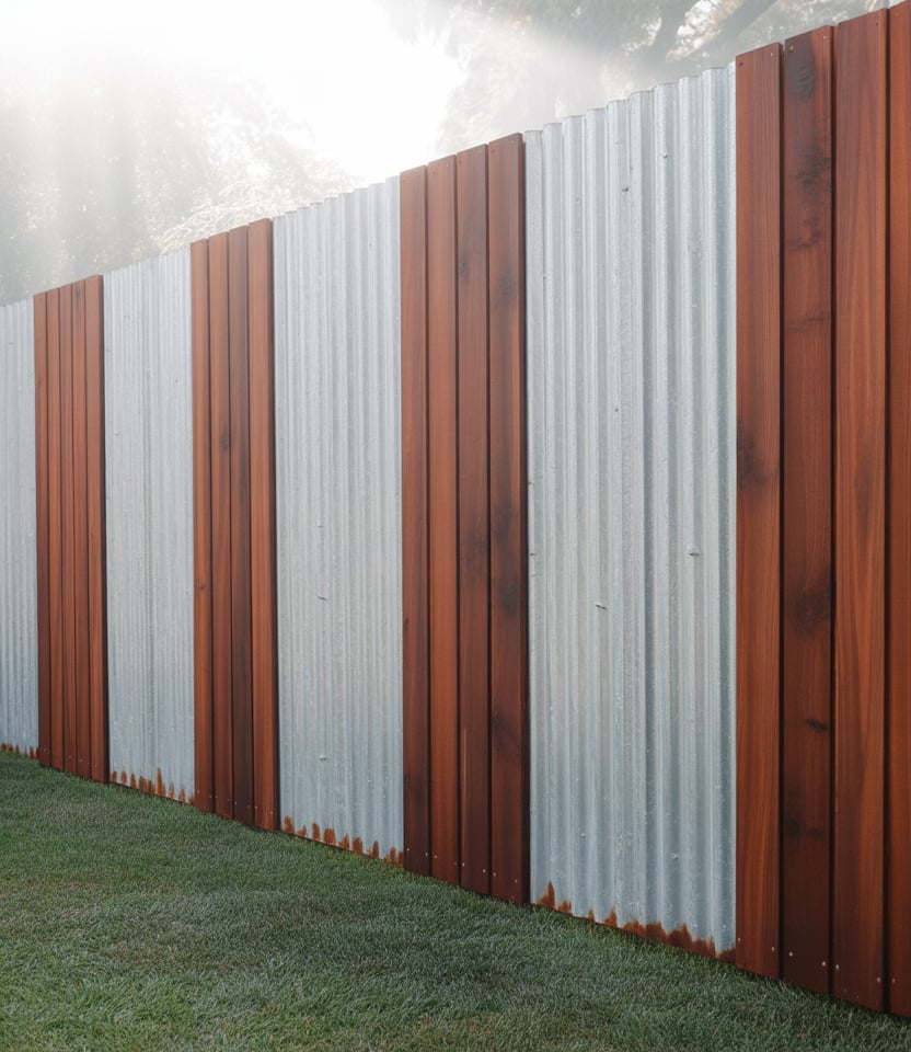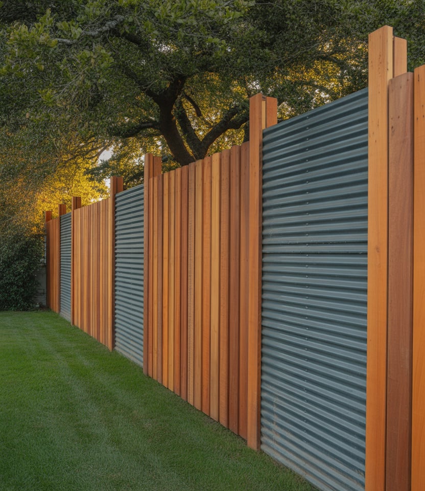 Combine wood and metal in alternating panels. For instance, wood slats interspersed with corrugated metal sections for contrast. Ideal for modern backyard ideas, for pool area, or for large properties wanting distinct style. The hybrid aesthetic is bold yet functional.