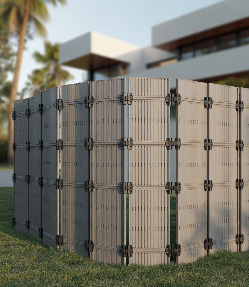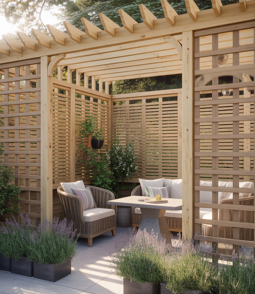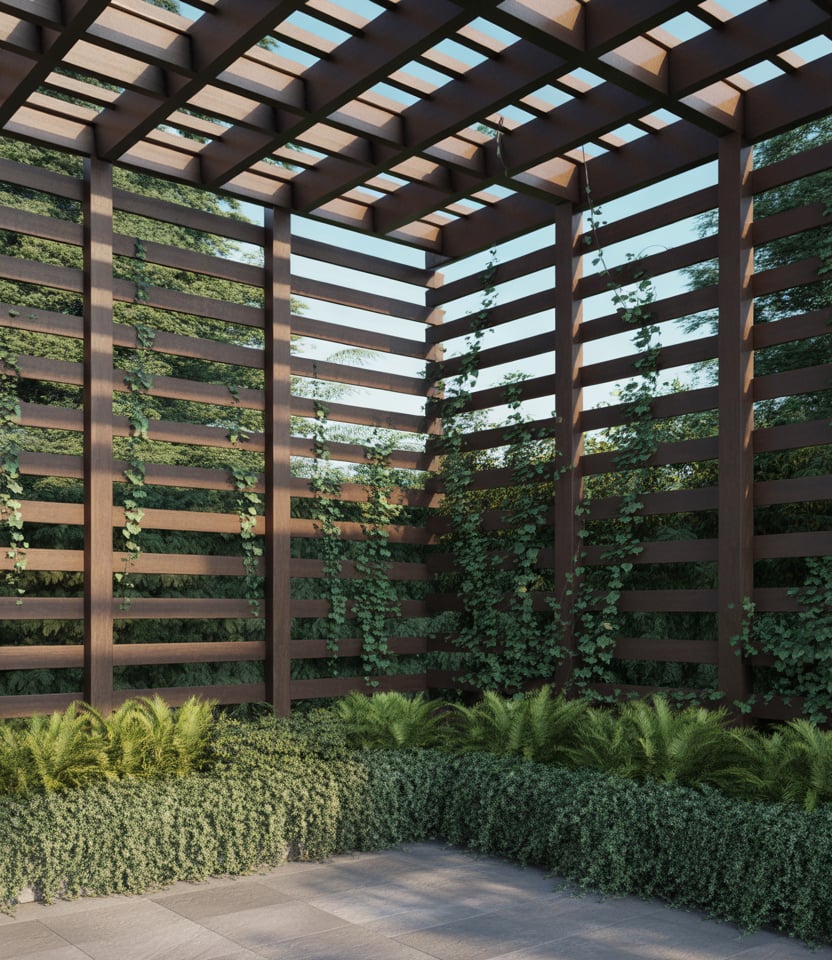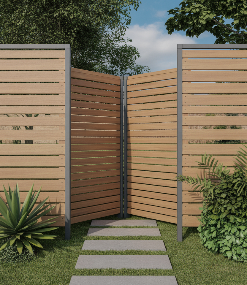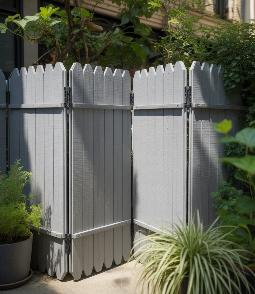 Ideal if you rent, remodel, or need seasonal privacy. Use prefab temporary screens in wood, metal, or composite that you can anchor and later remove. Good for patio, pool area, or small areas. Look for foldable or modular panels.