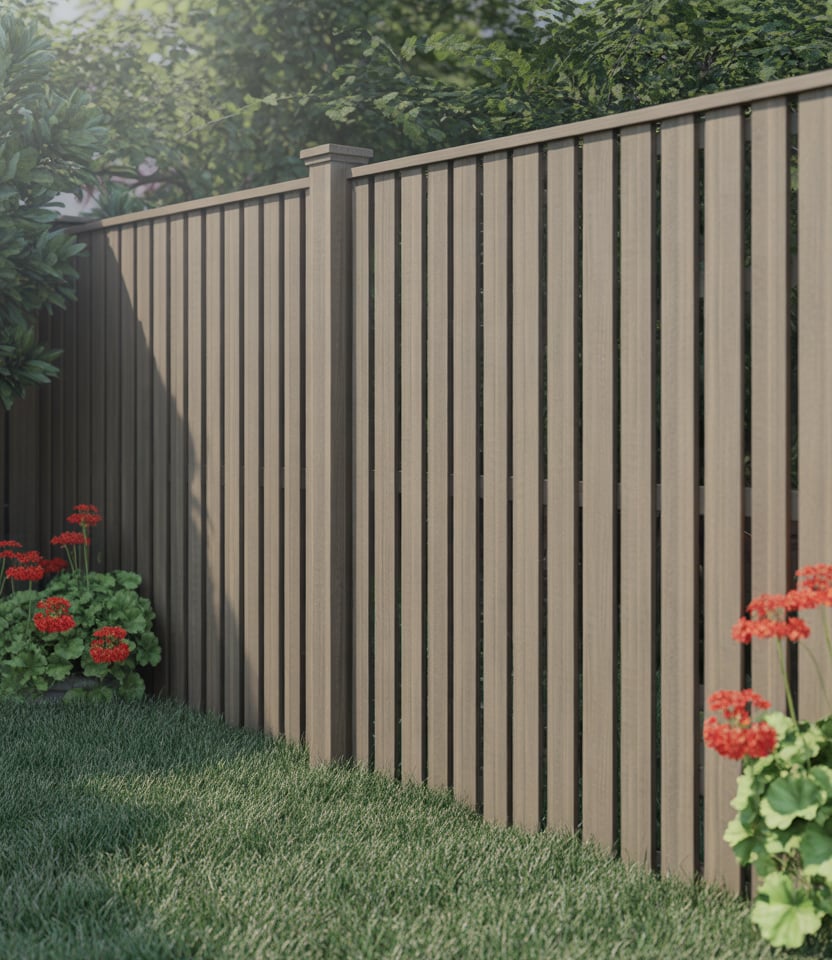 Use composite boards (wood-plastic blends) in vertical arrangement. Durable, low-maintenance, and available in black, white, or natural tones. Works for backyard, pool area, or small areas. Composite gives a cleaner aesthetic and resist warping, while permitting diy installation.