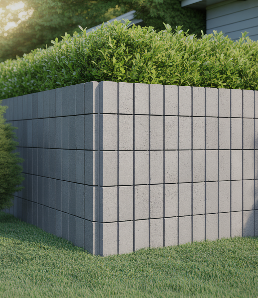 Precast or modular interlocking concrete or composite slabs that slot together. This gives a sleek, modern barrier. Great for large properties, for backyard, or pool area. Once in place, you can plant at the base or paint.