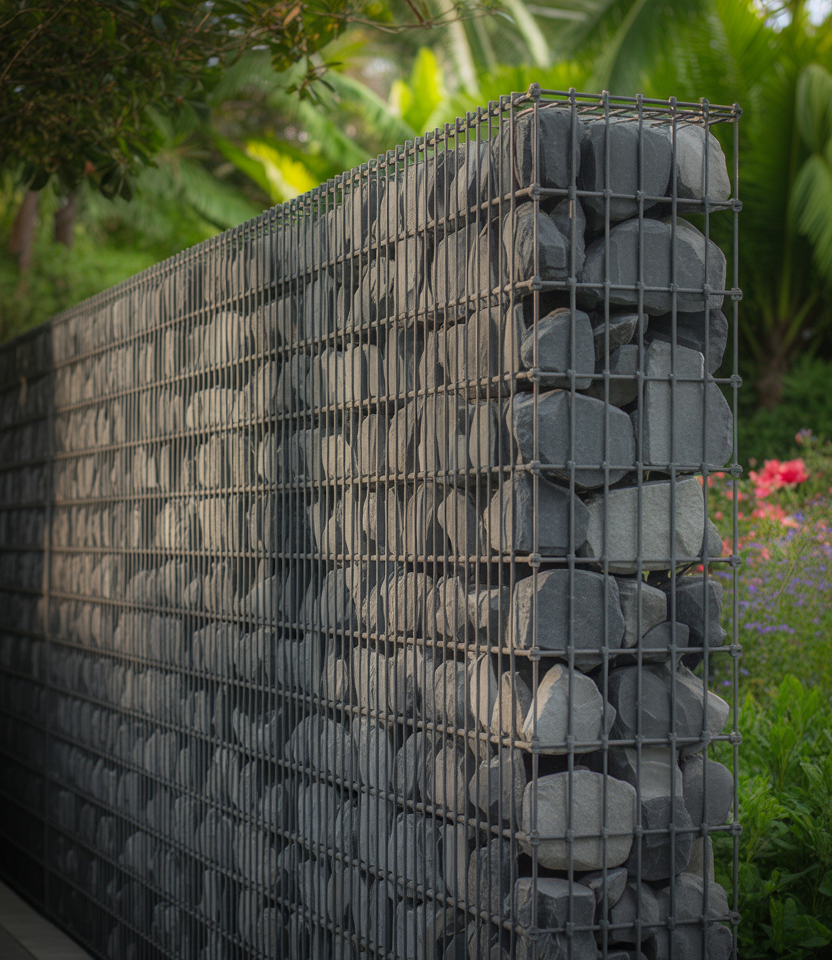 Gabion fences use wire cages filled with stone or aggregate. They convey an industrial–rustic feel and probably are the best option for sound insulation. Optimal for large properties, pools, or even front yard accent sections. In terms of pricing, though, these really are a bit steep; stone may be recycled for less. Top notching of timber capping for contrast.