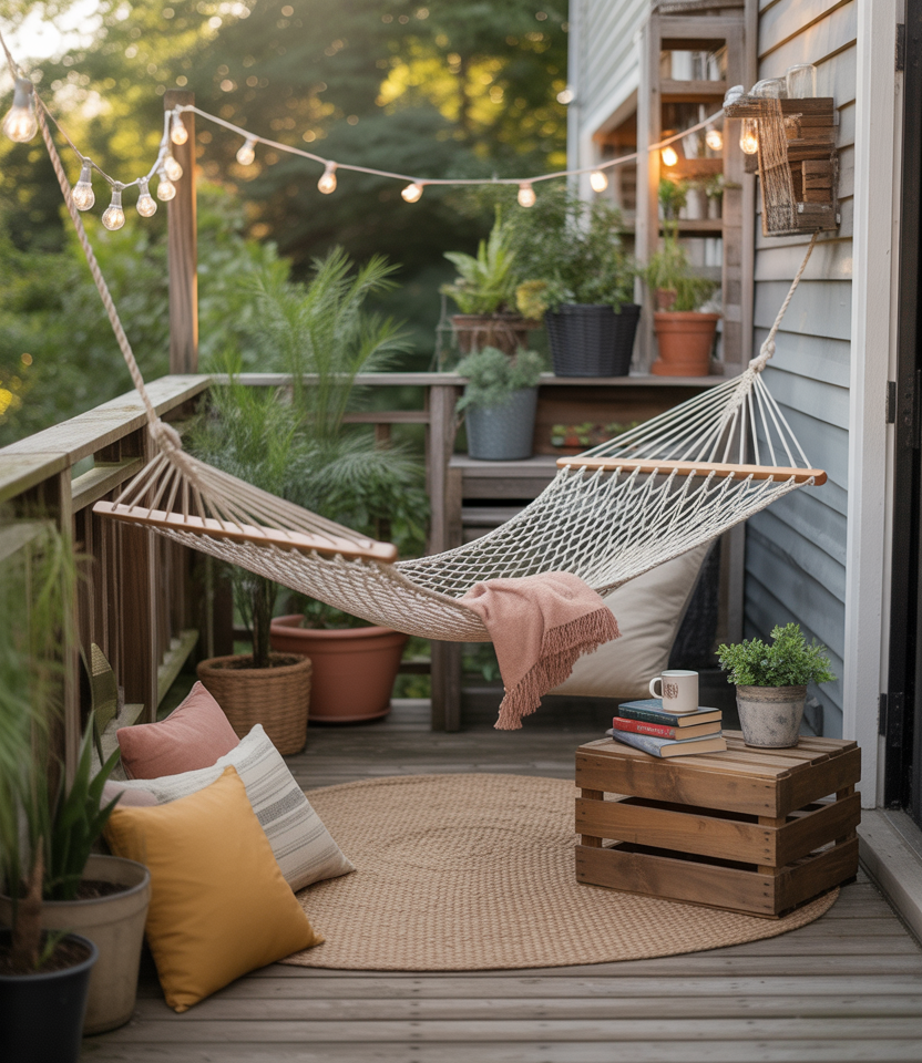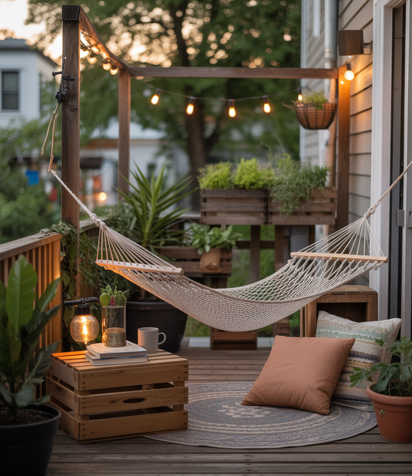 Convert a neglected corner into a peaceful refuge by hanging a hammock between posts or along a deck railing. Add string lights, throw blankets, and plants with easy DIY projects cheap on a budget. I’ve seen this done even on narrow townhouse patios—it instantly boosts relaxation vibes. This small addition delivers massive comfort, proving that serenity doesn’t require a huge footprint or luxury spending.