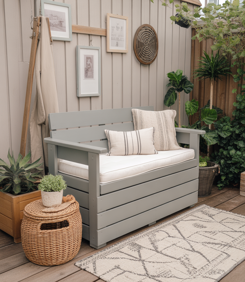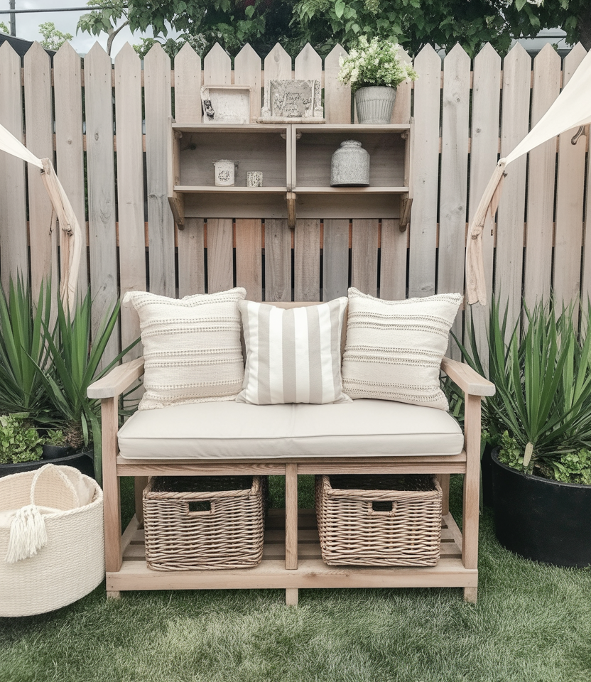 Max out your space by merging benches with built-in storage—the best budget-easy DIY farmhouse hack for tiny backyards. I built one myself from repurposed pallets, storing tools and cushions in hiding. It conceals clutter but remains cozy. Pair with neutral colors and throw pillows for that farmhouse-chic coziness making its way into 2026. This two-for-one design illustrates that cleverness trumps size any day.