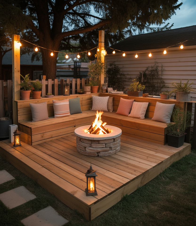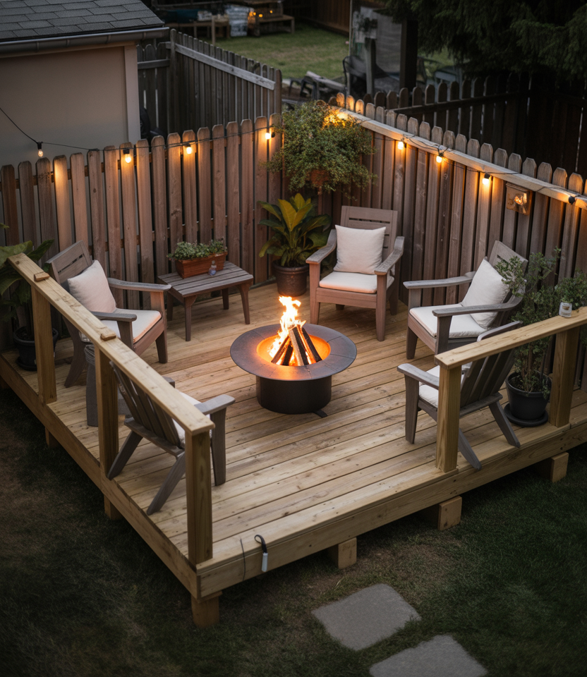 Create height and interest in a small backyard by building an elevated deck that accommodates a cozy fire pit area—combining a budget-easy patio DIY project mindset with weekend DIY enthusiasm. A raised wooden deck adds dimension and defines space; then a built-in or prefabricated fire pit becomes the focal point for evenings outdoors. I remember crafting this kind of setup with friends: we installed decking over a concrete pad, then anchored a circular fire feature surrounded by Adirondack chairs. It became the favorite spot for chilling with friends.