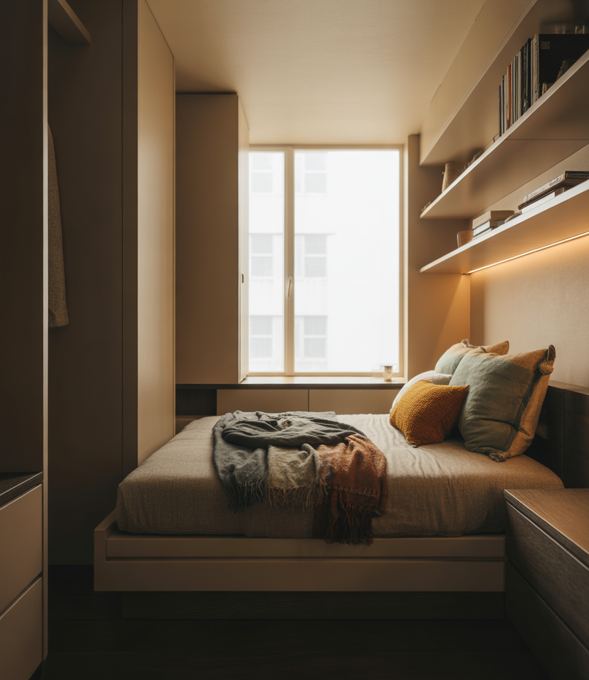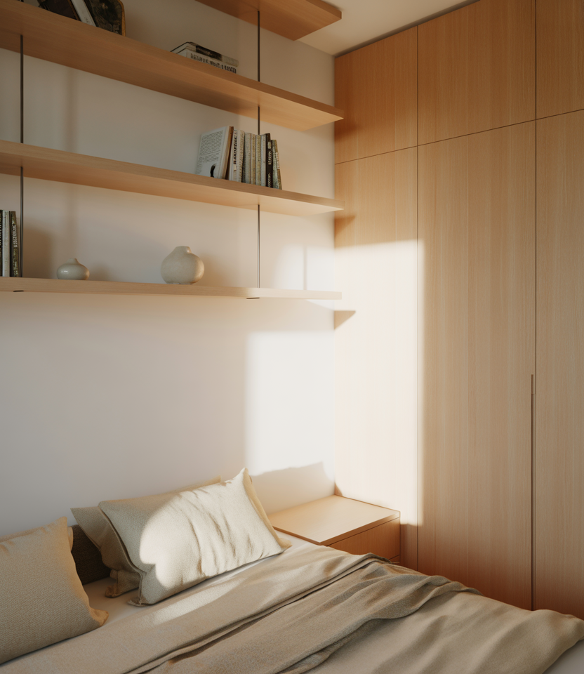 In a tight bedroom, floating shelves can feel almost architectural, shaping the room without adding bulk. Paired with light wood tones and a compact closet, they offer display and storage without overwhelming the layout. A touch of teens’ décor or a soft, cozy blanket keeps the space personal while staying streamlined.