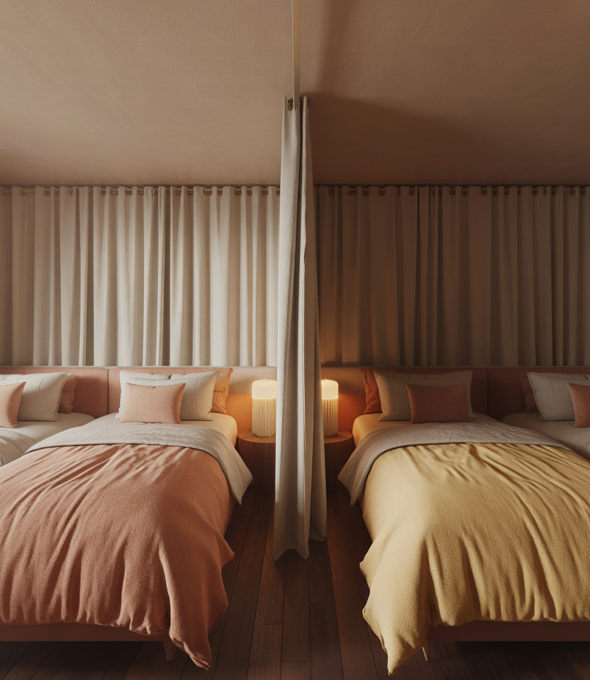 Lightweight partitions—curtains, slim panels, or shelving—work wonders in shared bedrooms where privacy matters. A semi-opaque divider keeps the room airy while allowing each side’s cozy, relaxing touches to shine. Add an aesthetic rug or gentle pink tone to connect both halves visually.