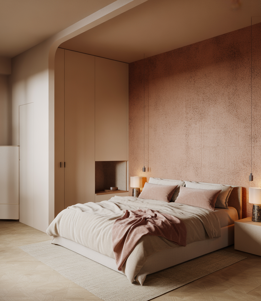 A textured accent wall—limewash, fabric panels, or tasteful wallpaper—gives depth without clutter. It pairs beautifully with a cozy palette, a slim closet setup, or hints of couples styling. Add a low-profile nightstand for an inviting, cozy, aesthetic-driven focal point.
