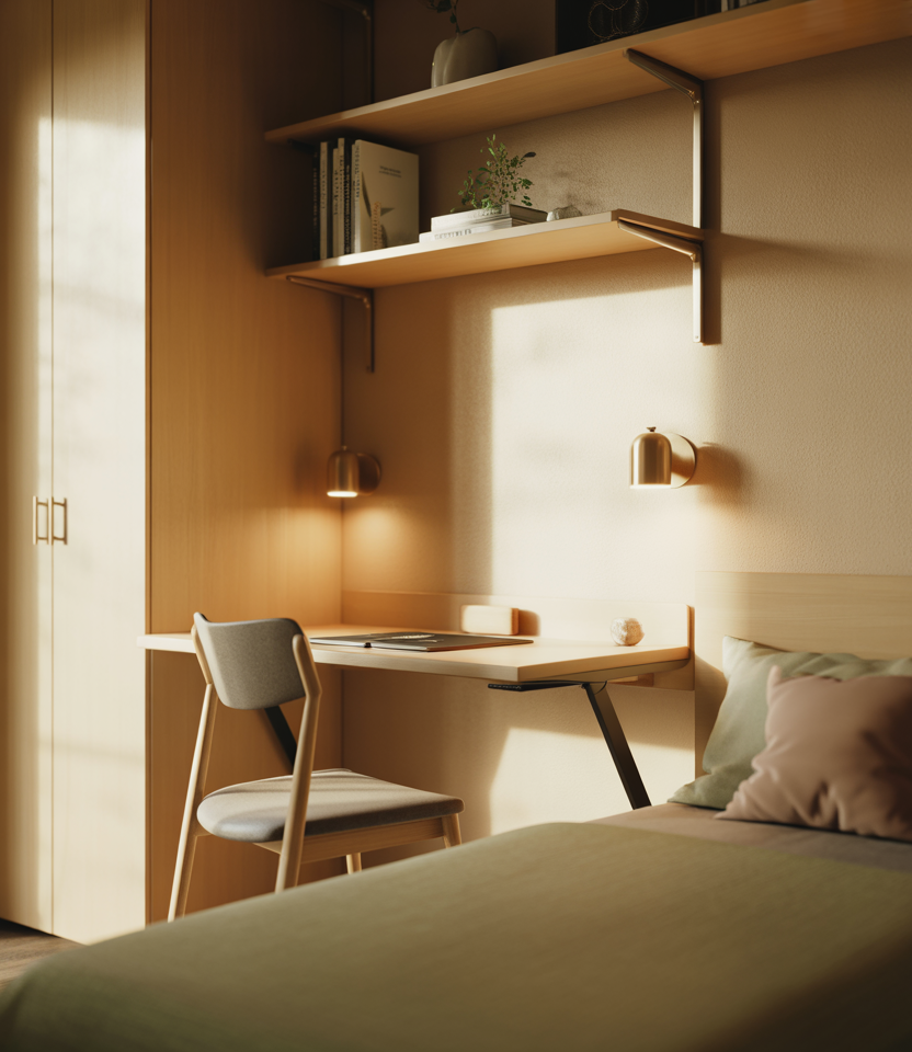 If your bedroom doubles as a workspace, a hidden desk is a lifesaver. A fold-down surface blends into the wall when not in use, keeping a very small footprint. Pair it with modular shelves, a subtle aesthetic lamp, or soft extra baskets. Even Ikea versions can look custom with the right styling.