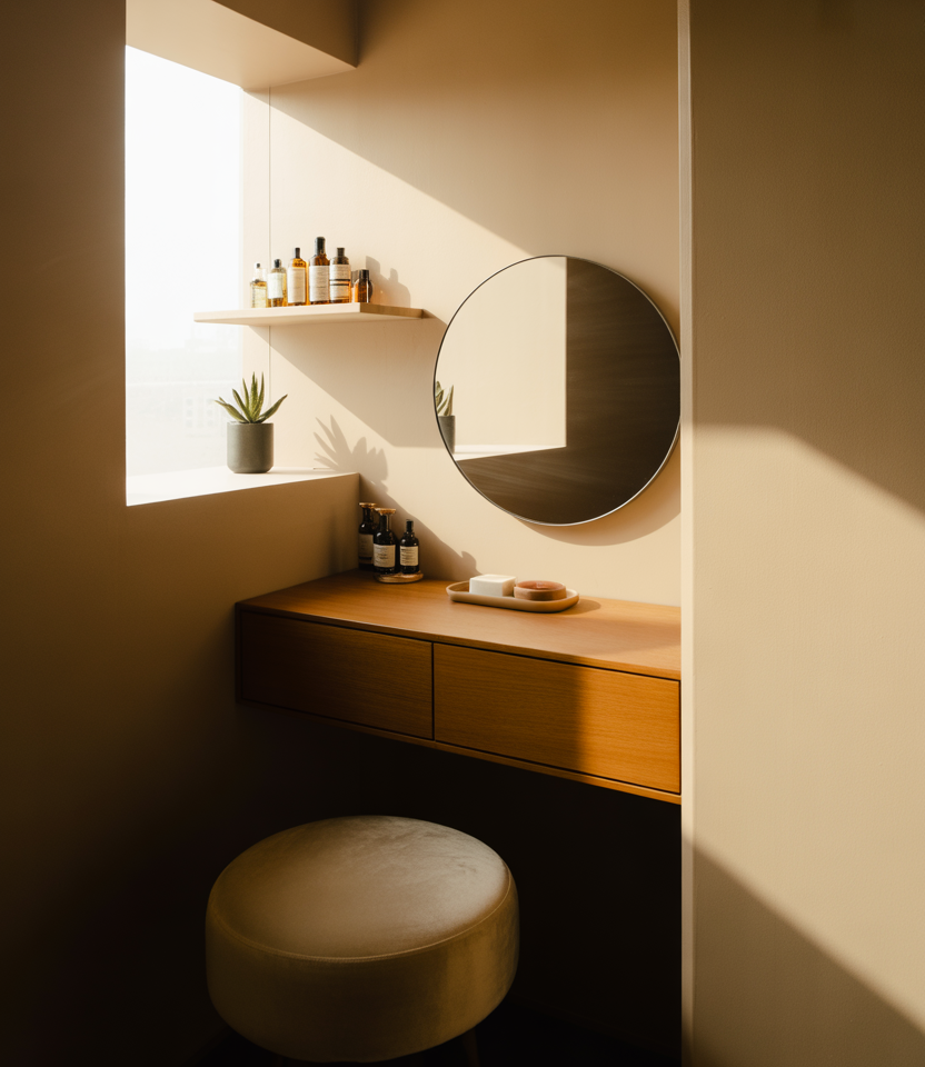 A tiny vanity can fit beautifully into a small bedroom, especially when paired with a wall-mounted mirror and slim stool. Add soft tones, an aesthetic tray, or touches from Bloxburg inspiration to keep the setup clean and sweet. A whisper of pink or cozy aesthetic décor pulls the nook together without crowding the room.