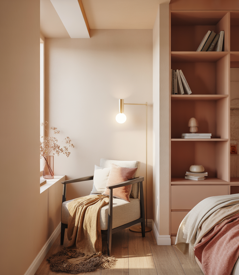 Creating a reading corner within a small bedroom is surprisingly doable. Think about carving out space beside a single bed with layered throws, super soft seating, or a narrow sconce. Add a warm pink accent or a textured pillow for visual charm, keeping the vibe authentically aesthetic.