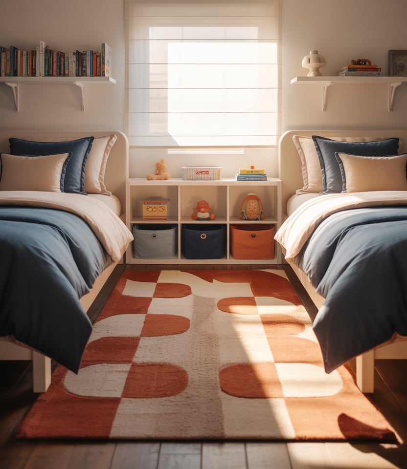 When siblings share a room, every inch counts. Using stackable bins, a sturdy Ikea frame, or a unified color palette keeps the room feeling spacious. A shared central rug or dual lamps helps divide “zones” without walls. Subtle extra storage baskets maintain order during busy mornings.