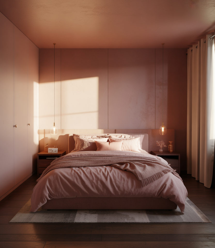 Romantic small bedrooms thrive on diffused lighting and tactile textiles. Mixing warm neutrals with a cozy relaxing palette, a soft couples throw, or even a charming pink accent adds personality. A compact layout with low furniture helps maintain flow without sacrificing intimacy.