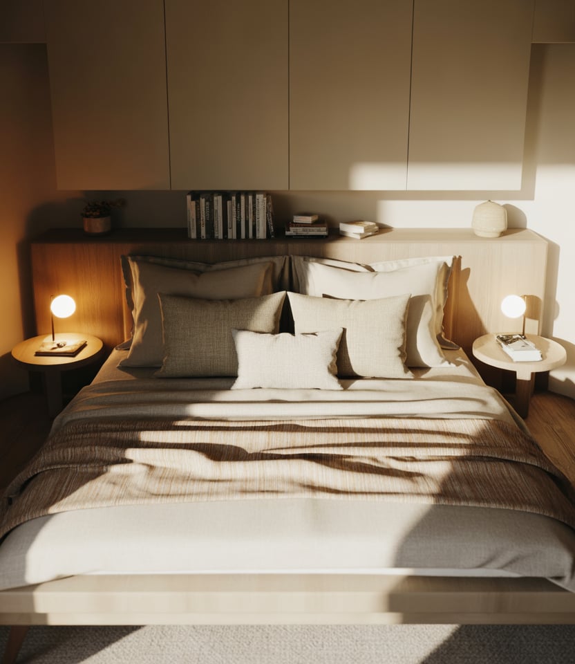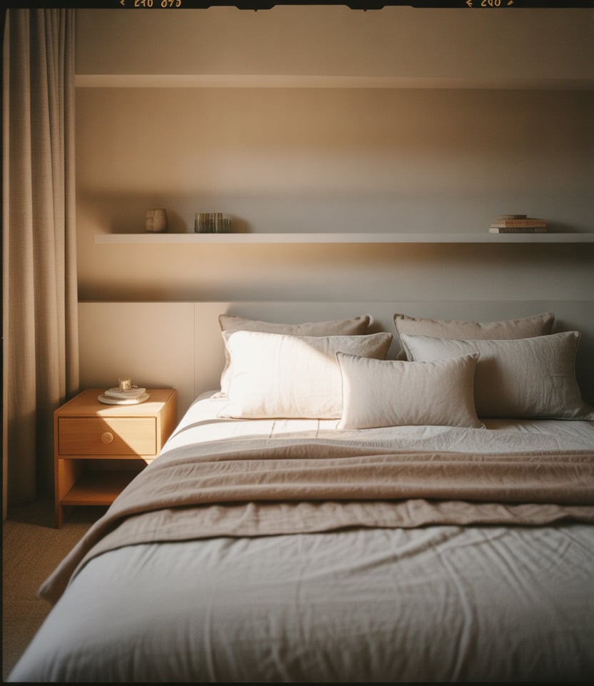A layered neutral retreat works beautifully in compact rooms, especially when soft textures calm visual noise. Mixing warm woods with airy linens keeps the space grounded yet light. Adding details inspired by cozy aesthetics, a compact closet, or a slim TV shelf helps everything feel intentionally curated without overwhelming the footprint.