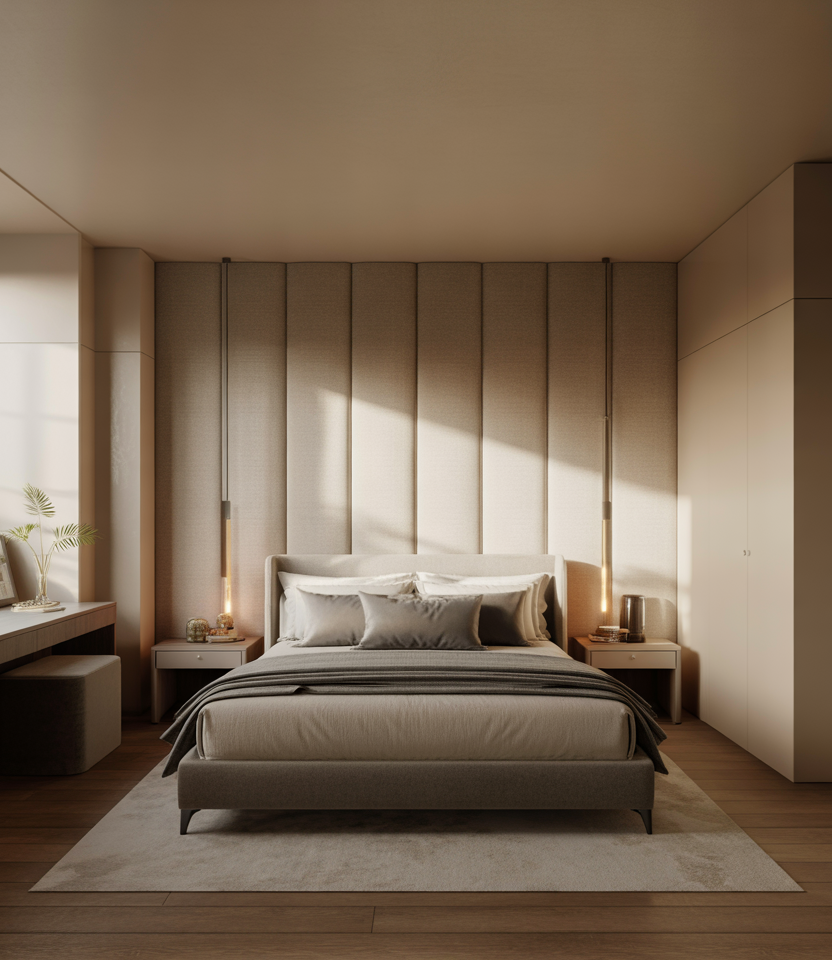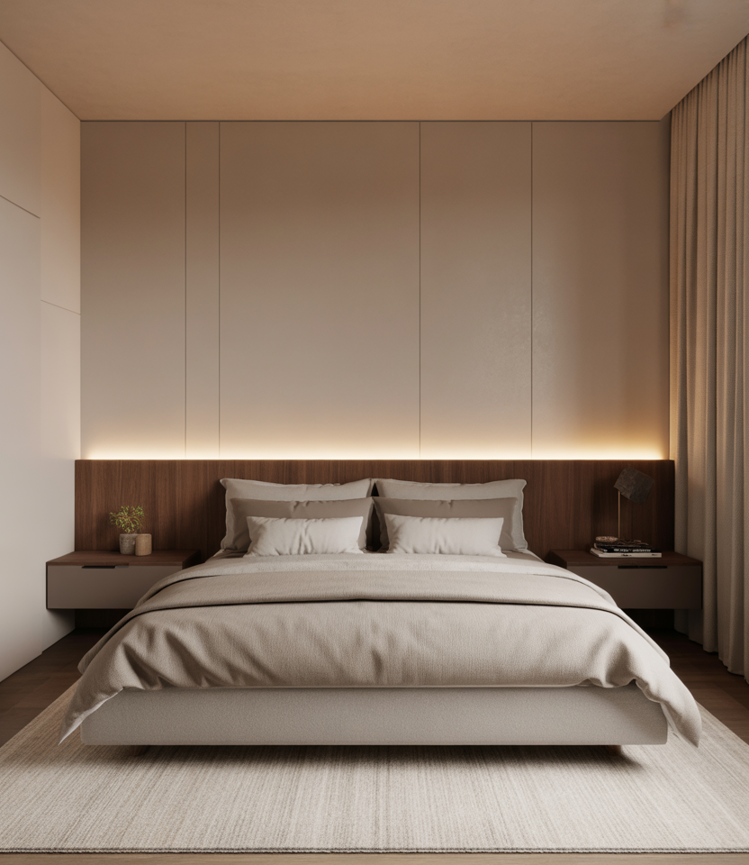 A built-in headboard wall adds presence without stealing floor space. Pairing it with muted tones, subtle LED edges, or an aesthetic panel brings depth. A slim TV shelf or floating nightstands keeps surfaces clean. Even in compact rooms, this feature feels very polished and cozy.