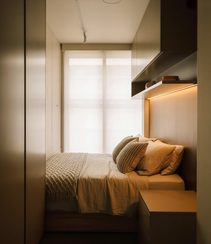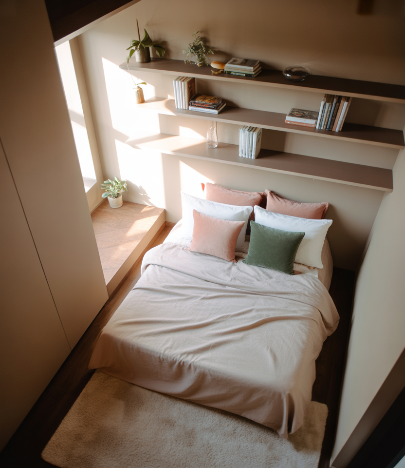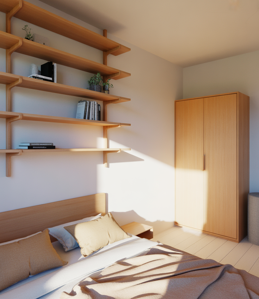 In a tight bedroom, floating shelves can feel almost architectural, shaping the room without adding bulk. Paired with light wood tones and a compact closet, they offer display and storage without overwhelming the layout. A touch of teens’ décor or a soft, cozy blanket keeps the space personal while staying streamlined.