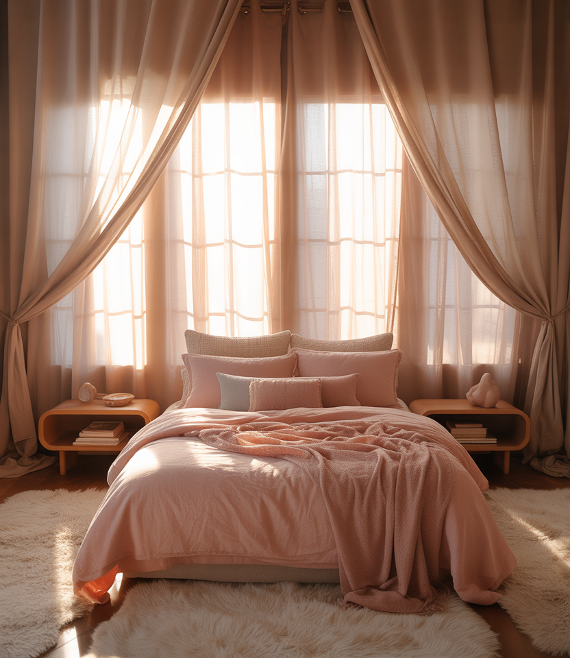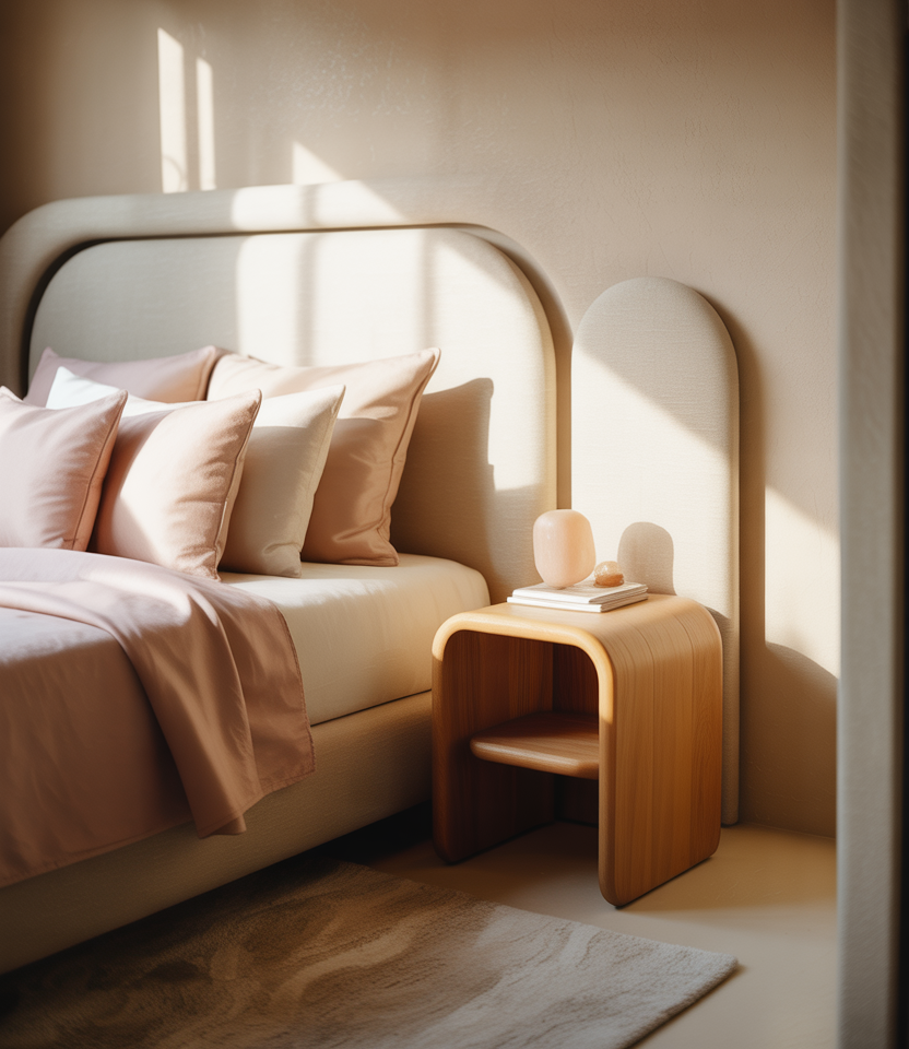 Curved lines—rounded nightstands, arched headboards—help soften tight bedrooms and improve movement. They work beautifully around a single bed or even a petite, super-plush rug. Add a whisper of pink or a simple aesthetic accent to keep the palette warm and inviting while maintaining visual ease.