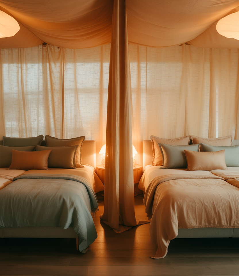 Lightweight partitions—curtains, slim panels, or shelving—work wonders in shared bedrooms where privacy matters. A semi-opaque divider keeps the room airy while allowing each side’s cozy, relaxing touches to shine. Add an aesthetic rug or gentle pink tone to connect both halves visually.