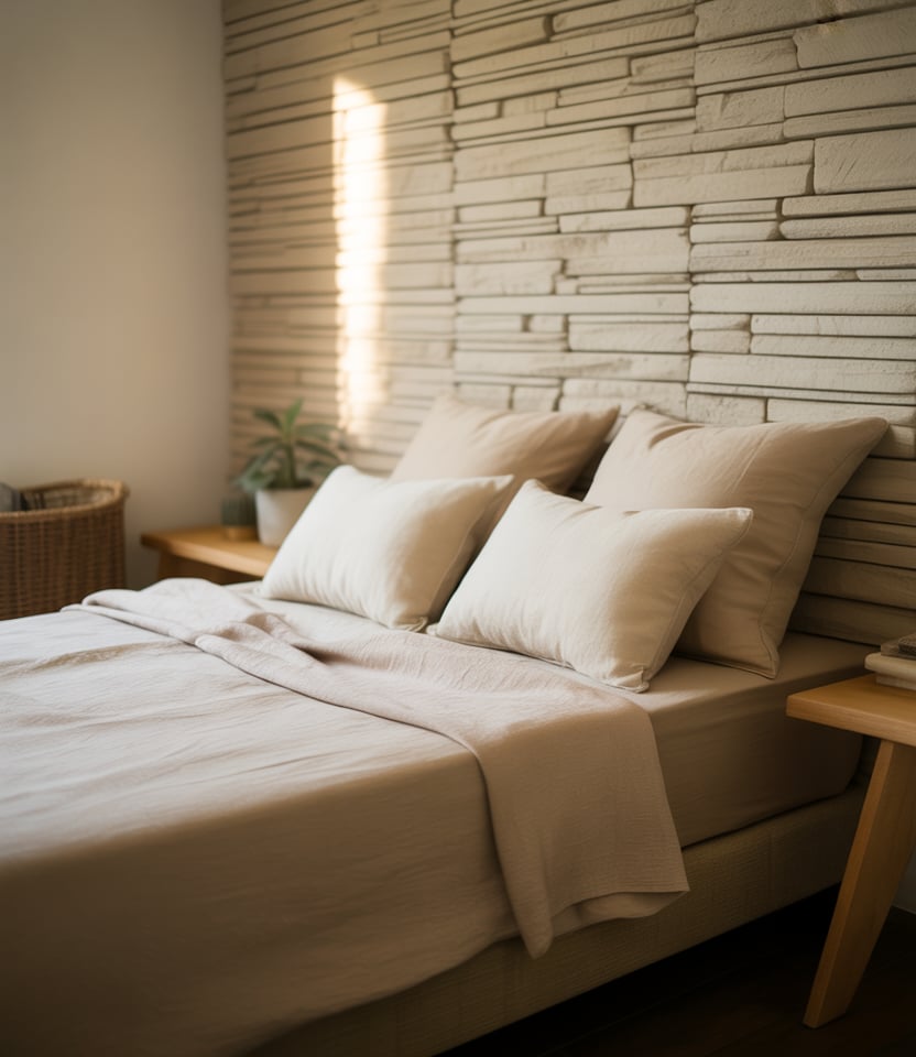 A textured accent wall—limewash, fabric panels, or tasteful wallpaper—gives depth without clutter. It pairs beautifully with a cozy palette, a slim closet setup, or hints of couples styling. Add a low-profile nightstand for an inviting, cozy, aesthetic-driven focal point.