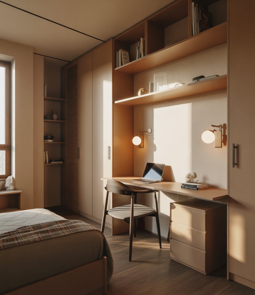 If your bedroom doubles as a workspace, a hidden desk is a lifesaver. A fold-down surface blends into the wall when not in use, keeping a very small footprint. Pair it with modular shelves, a subtle aesthetic lamp, or soft extra baskets. Even Ikea versions can look custom with the right styling.