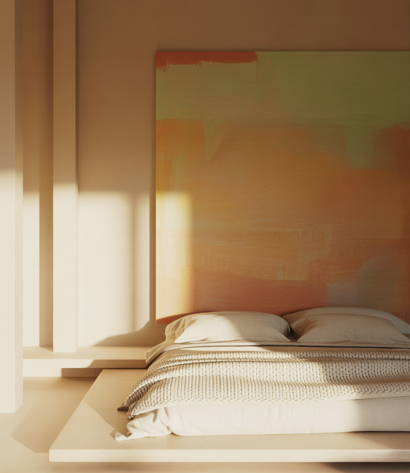 Keeping furniture low helps a compact room breathe. Platform frames, squat dressers, and minimal nightstands free up vertical space for large-scale art. Add touches of pink, aesthetic greenery, or soft cozy textures. A slim wall-mounted TV can balance the composition without stealing attention.