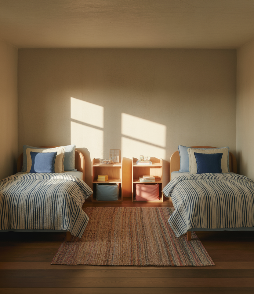 When siblings share a room, every inch counts. Using stackable bins, a sturdy Ikea frame, or a unified color palette keeps the room feeling spacious. A shared central rug or dual lamps helps divide “zones” without walls. Subtle extra storage baskets maintain order during busy mornings.