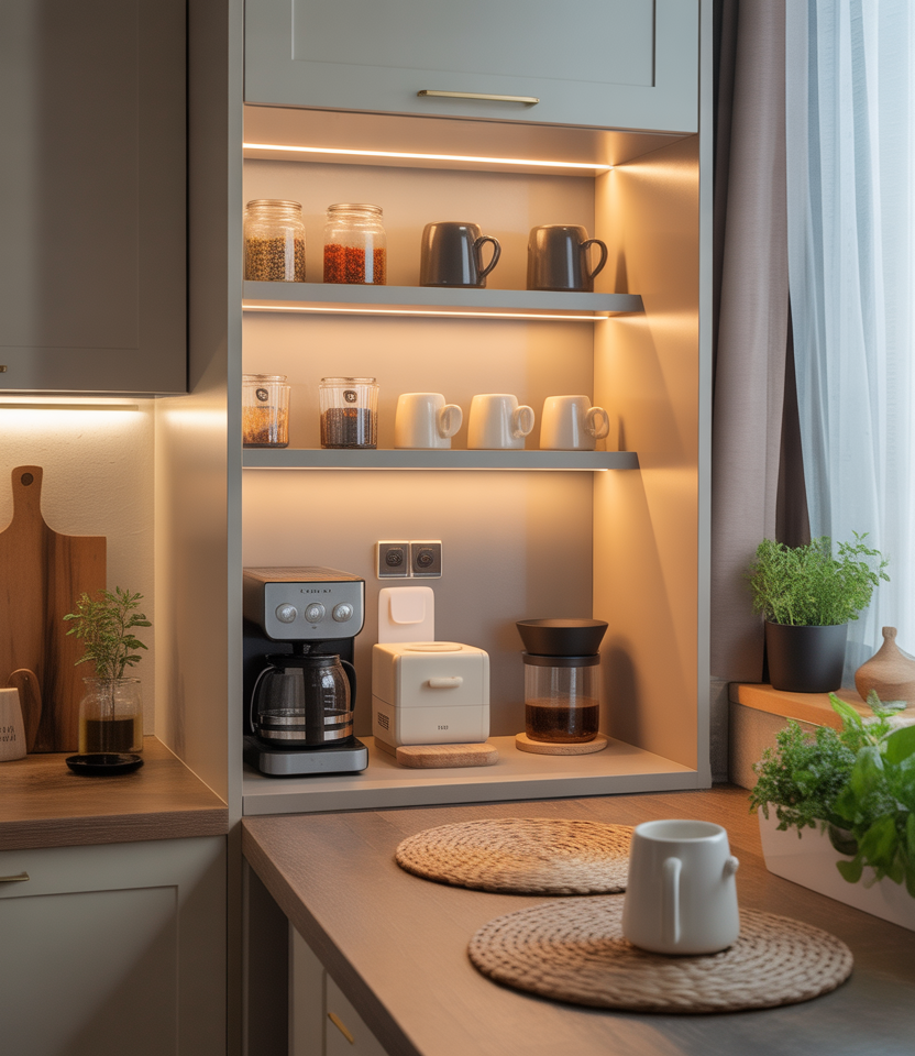 A compact coffee nook adds charm while staying within a budget. Many renters carve out tiny beverage stations using narrow shelves, wall-mounted rails, and a single countertop appliance. I once advised a colleague who transformed an unused gap beside her fridge into a charming micro-coffee bar that guests adored. Editors at Apartment Therapy widely recommend this approach due to its low cost and high delight factor.