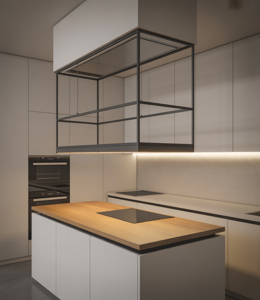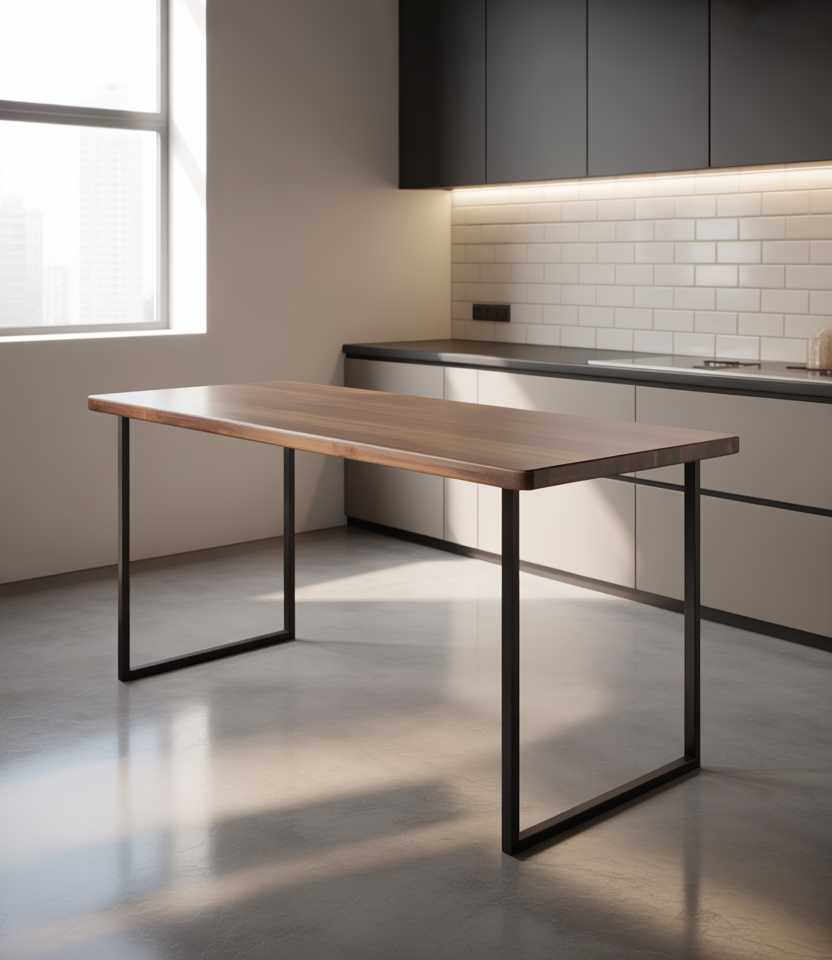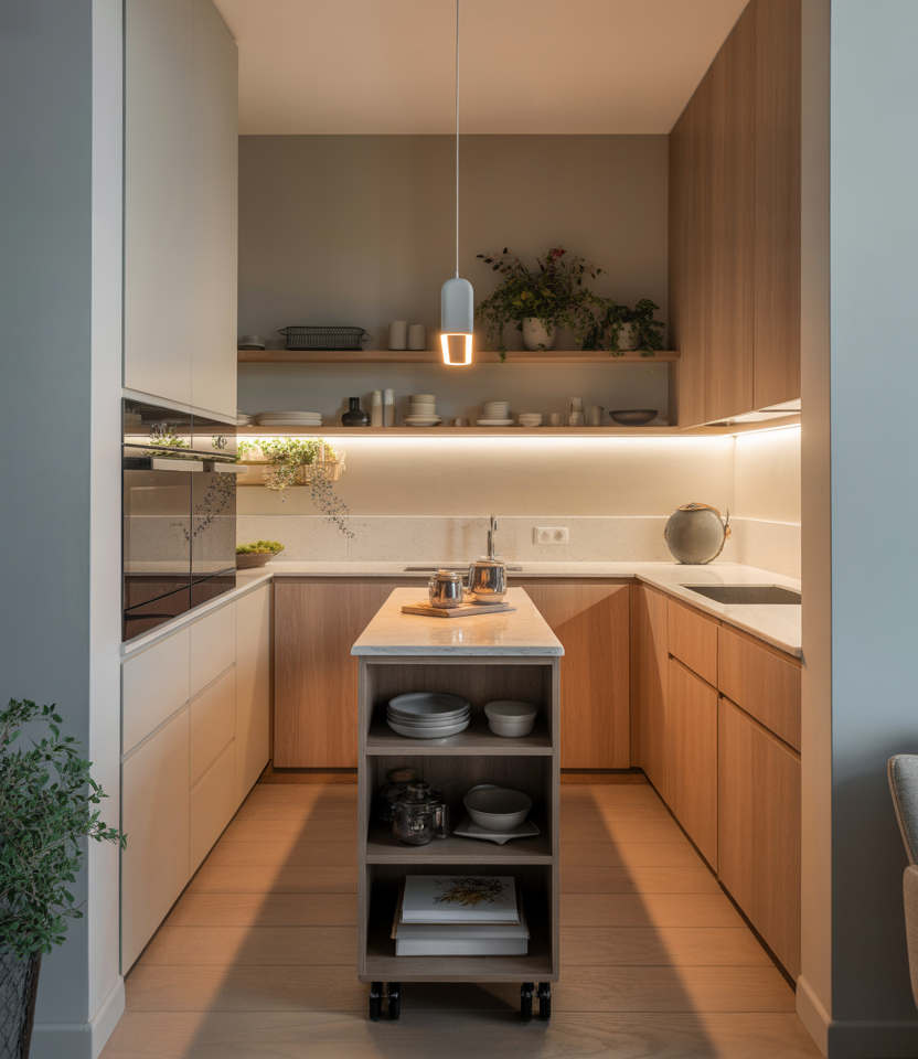 A floating workstation acts like a small, super light island without consuming visual space. This suits renters and homeowners who need flexibility. I saw this implemented in a Phoenix condo where a slim metal frame with a wood top became both a prep surface and a dining spot. Design writers at Dezeen often note that transparency in furniture helps compact rooms feel less boxed in.