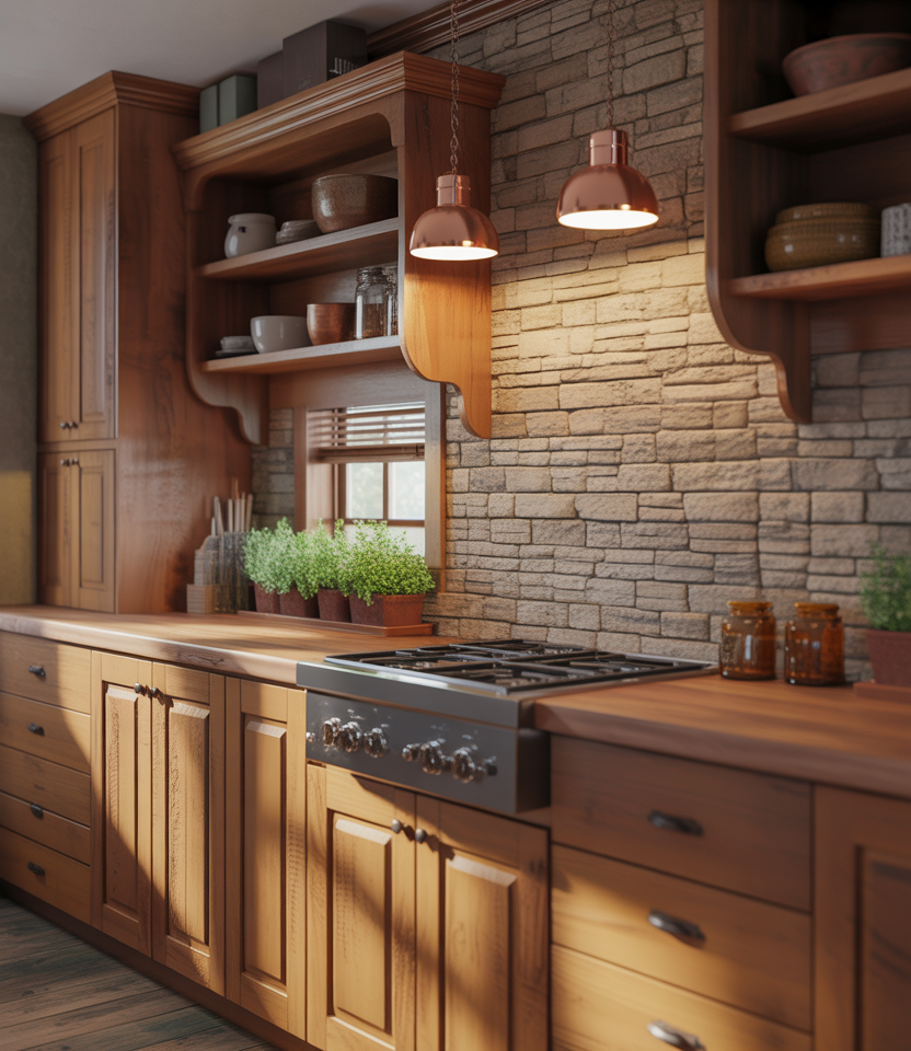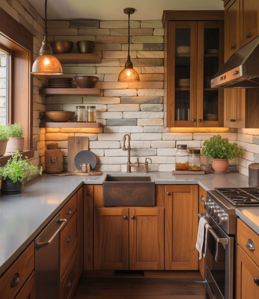 A petite kitchen gains richness from a textured rustic stone backsplash, bringing in natural warmth without crowding the space. In a Vermont bungalow I visited, a homeowner added honed slate behind the cooktop, and it instantly grounded the space. Experts at Remodelista stress that tactile, natural finishes make even tiny kitchens feel curated and intentional.