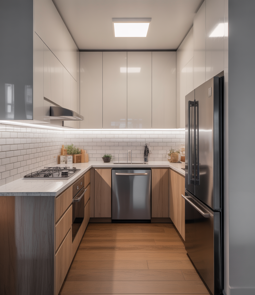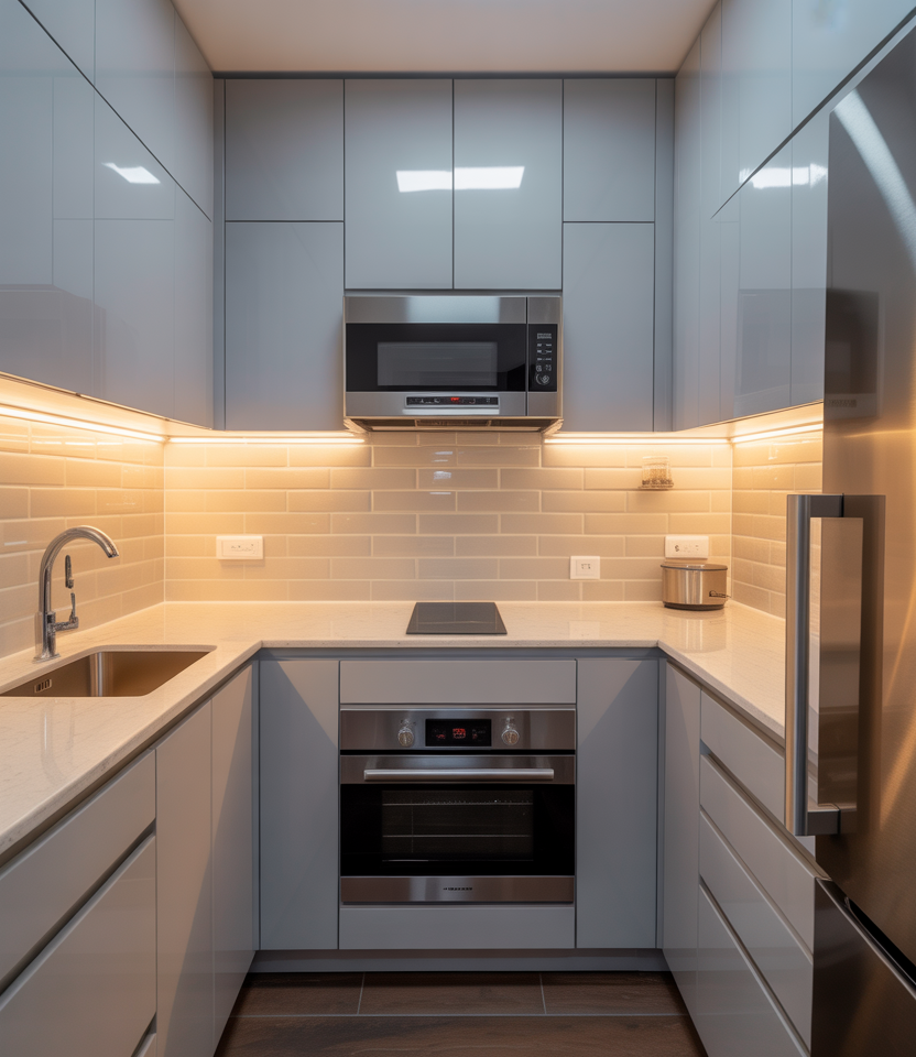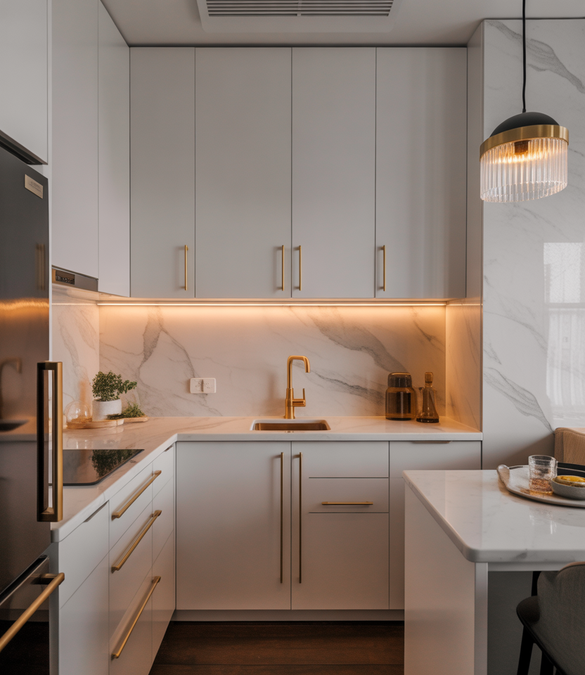 A modern luxury feel is absolutely possible in a 2mx2m kitchen, especially with reflective surfaces, slim lighting profiles, and strategic materials. I once saw a tiny San Francisco kitchenette elevated dramatically with brushed brass handles and a marble-look backsplash. Many luxury designers now emphasize that scale doesn’t limit quality—finish selection does.