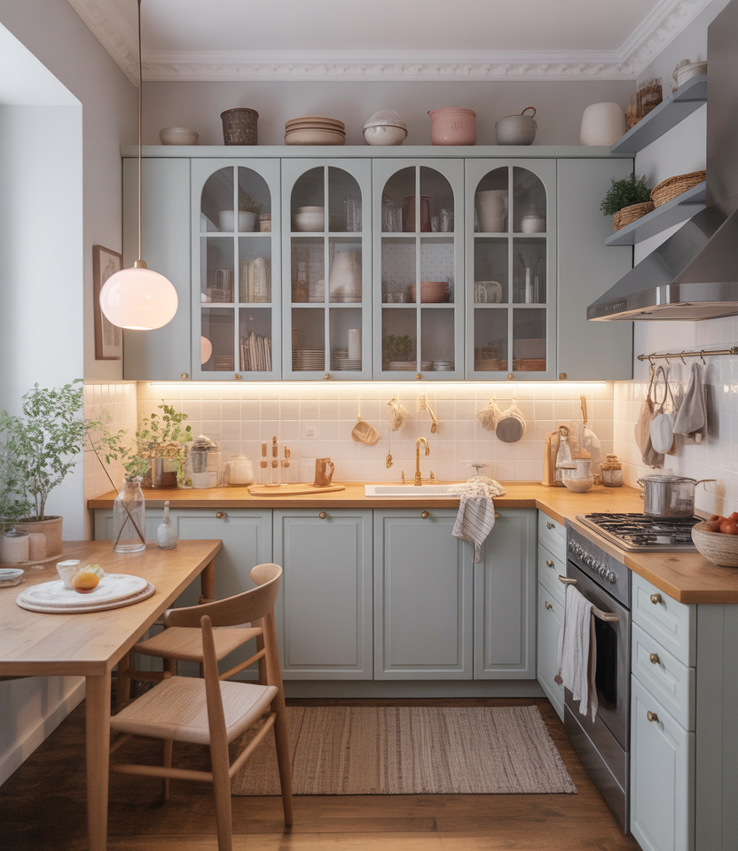 An aesthetic kitchen relies on mood: soft color, balanced décor, and curated details that elevate a compact space without crowding it. I once toured a Boston micro-loft where pastel cabinetry and warm wood instantly softened the tight feel. Bloggers like Bri Emery frequently show that gentle tones can make even the smallest kitchens photograph beautifully while remaining practical.
