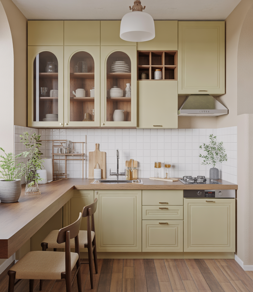 An aesthetic touch like slim glass-front uppers softens the kitchen visually while showcasing curated pieces. The right color and lighting transform these cabinets into a subtle feature wall. I once visited a Chicago loft where frosted-glass uppers made a tiny kitchen glow at night. Many stylists recommend selective display as a way to add charm without clutter.